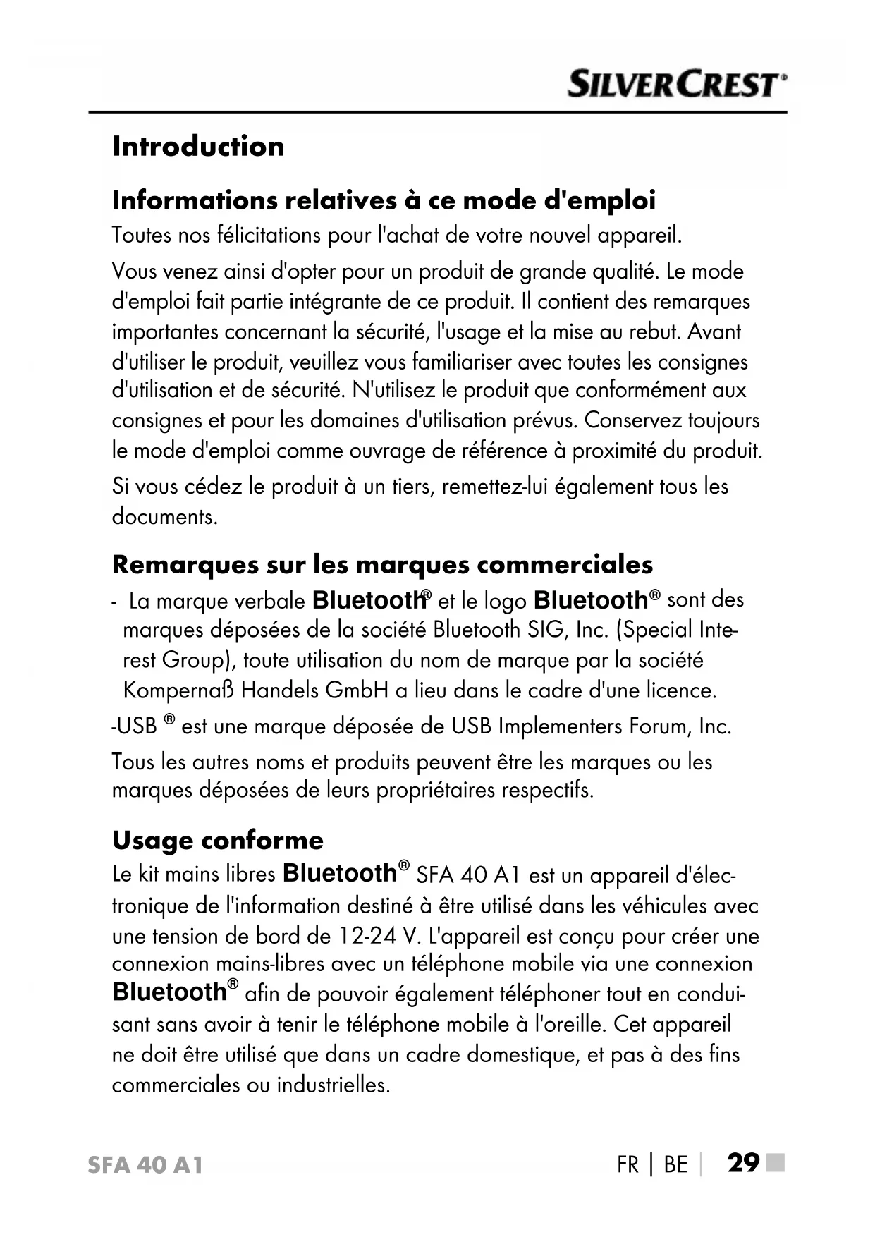 Le kit mains libres Bluetooth® SFA 40 A1 est un apparéil d'électronique de l'information destiné à être utilisé dans les vehicules avec une tension de bord de 12-24 V. L' apparéil est conçu pour créé une connexion mains-libres avec un téléphone mobile via une connexion Bluetooth® afin de pouvoir également téléphoner tout en conduitsant sans avoir à tener le téléphone mobile à l'oreille. Cet apparéil ne doit être utilisé que dans un cadre domestique, et pas à des fins commerciales ou industrielles.