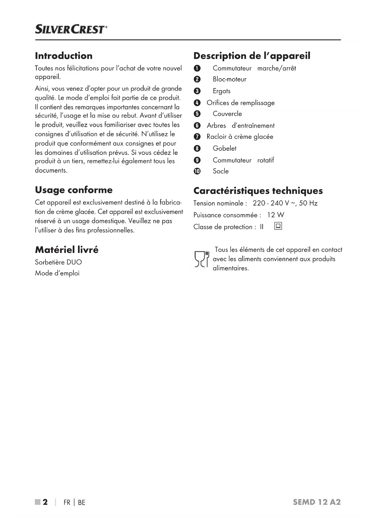 Introduction Toutes nos félicitations pour l’achat de votre nouvel appareil. Ainsi, vous venez d’opter pour un produit de grande qualité. Le mode d’emploi fait partie de ce produit. Il contient des remarques importantes concernant la sécurité, l’usage et la mise au rebut. Avant d’utiliser le produit, veuillez vous familiariser avec toutes les consignes d’utilisation et de sécurité. N’utilisez le produit que conformément aux consignes et pour les domaines d’utilisation prévus. Si vous cédez le produit à un tiers, remettez-lui également tous les documents. Usage conforme Cet appareil est exclusivement destiné à la fabrica- tion de crème glacée. Cet appareil est exclusivement réservé à un usage domestique. Veuillez ne pas l’utiliser à des fins professionnelles. Matériel livré Sorbetière DUO Mode d’emploi Description de l’appareil Commutateur marche/arrêt Bloc-moteur Ergots Orifices de remplissage Couvercle Arbres d’entraînement Racloir à crème glacée Gobelet Commutateur rotatif Socle Caractéristiques techniques Tension nominale: 220 - 240 V ∼, 50 Hz Puissance consommée: 12 W Classe de protection: II Tous les éléments de cet appareil en contact avec les aliments conviennent aux produits alimentaires.SEMD 12 A2
