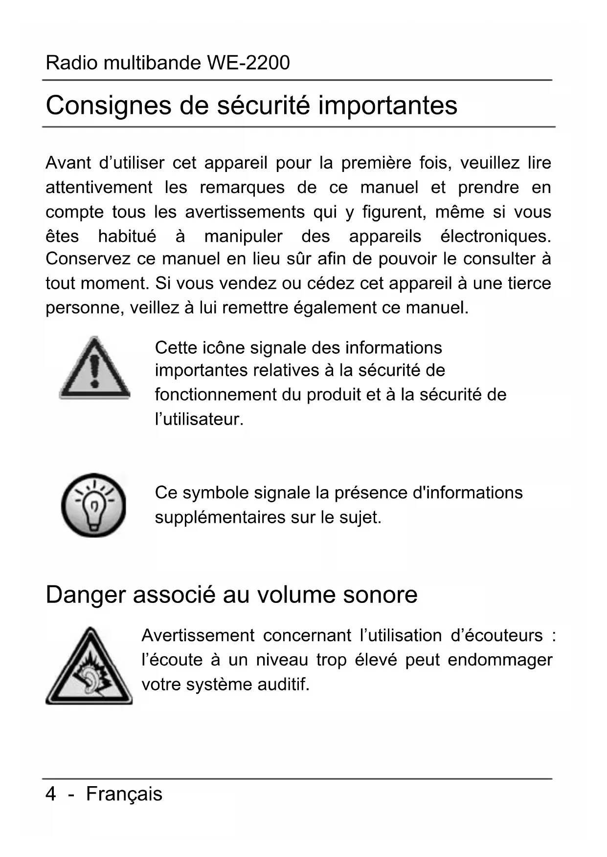 Ce symbole signale la présence d'informations supplémentaires sur le sujet. Danger associé au volume sonore Avertissement concernant l’utilisation d’écouteurs : l’écoute à un niveau trop élevé peut endommager votre système auditif.Radio multibande WE-2200 Français - 5 Conditions d’utilisation L’appareil n’a pas été conçu pour être utilisé dans des environnements poussiéreux ou exposés à une température ou une humidité excessive (salle de bain, par exemple). Température et humidité de fonctionnement : De 5 °C à 35 °C, 85 % max. d’humidité relative. Observez toujours les précautions suivantes : Assurez-vous que la ventilation de l’appareil est suffisante (ne le placez pas sur une étagère, un tapis, un lit ou dans un lieu où ses orifices de ventilation seraient obstrués) et réservez un espace d’au moins 10 cm de chaque côté de l’appareil. N’exposez pas l’appareil à des sources directes de chaleur (radiateurs, par exemple). N’exposez pas l’appareil à la lumière directe du soleil ou à une lumière artificielle trop intense. Évitez de renverser ou de vaporiser de l’eau ou des liquides abrasifs sur l’appareil. Ne l’utilisez jamais à proximité de l’eau. Ne plongez jamais l’appareil dans du liquide et ne placez aucun récipient contenant du liquide, tel que des boissons ou des vases, sur l’appareil ou à proximité. Ne placez jamais l’appareil à proximité de champs magnétiques (par exemple, haut-parleurs). Ne placez pas de sources incandescentes (bougies, etc.) sur l’appareil ou à proximité. N’introduisez pas de corps étrangers dans l’appareil.Radio multibande WE-2200