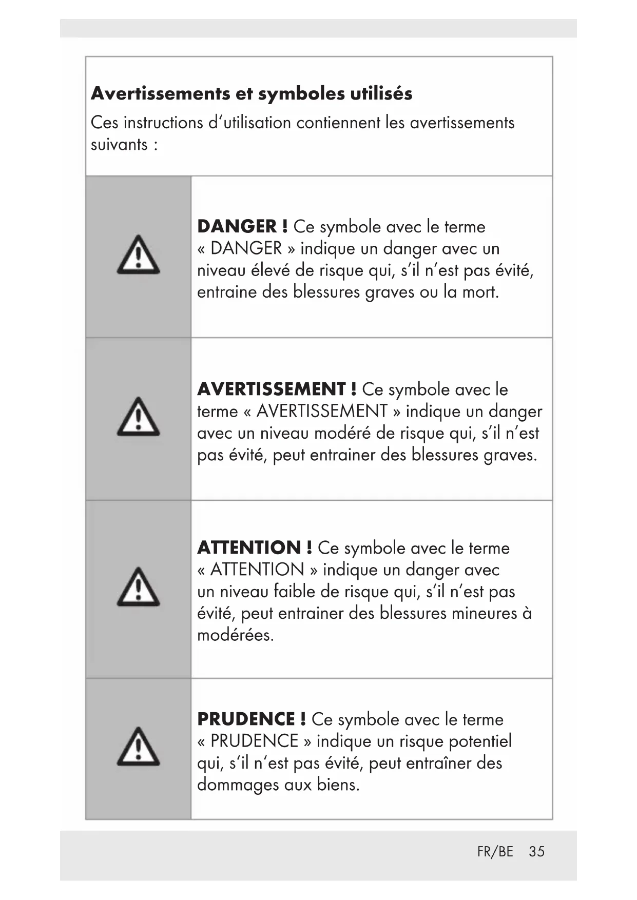 DANGER ! Ce symbole avec le terme «DANGER» indique un danger avec un niveau élevé de risque qui, s’il n’est pas évité, entraine des blessures graves ou la mort. AVERTISSEMENT ! Ce symbole avec le terme «AVERTISSEMENT» indique un danger avec un niveau modéré de risque qui, s’il n’est pas évité, peut entrainer des blessures graves. ATTENTION ! Ce symbole avec le terme «ATTENTION» indique un danger avec un niveau faible de risque qui, s’il n’est pas évité, peut entrainer des blessures mineures à modérées. PRUDENCE! Ce symbole avec le terme «PRUDENCE» indique un risque potentiel qui, s‘il n‘est pas évité, peut entraîner des dommages aux biens.FR/BE 36 REMARQUE: Ce symbole avec le terme «REMARQUE» fournit des informations utiles supplémentaires. Ce signe d’action indique de porter des gants de protection appropriés ! Suivez les instructions pour éviter les coups portés aux mains par des objets ou le contact avec des matériaux thermiques ou chimiques. Ce symbole signifie que les instructions de fonctionnement doivent être respectées lors de l‘utilisation du produit. Courant continu Technologie pour optimiser le temps de chargement. L‘équipement est conforme aux spécifications et aux conventions Quick Charge 3.0 émanant de Qualcomm Technologies, Inc.FR/BE 37 BATTERIE EXTERNE POWERBANK - 10 000 mAh P Introduction Nous vous félicitons pour l’achat de votre nouveau produit. Vous avez opté pour un produit de grande qualité. Le mode d‘emploi fait partie intégrante de ce produit. Il contient des indications importantes pour la sécurité, l’utilisation et la mise au rebut. Veuillez lire consciencieusement toutes les indications d‘utilisation et de sécurité du produit. Ce produit doit uniquement être utilisé conformément aux instructions et dans les domaines d‘application spécifiés. Lors d‘une cession à tiers, veuillez également remettre tous les documents. Utilisation prévue Cette BATTERIE EXTERNE POWERBANK (ci-après désignée «produit») est un dispositif informatique uniquement destiné à être utilisé pour charger des appareils mobiles qui sont normalement chargés via un port USB. Ce produit n‘est pas destiné à un usage commercial. Le fabricant n‘est pas responsable des dommages résultant d‘une utilisation non conforme. Avis relatif aux marques ‒ USB
