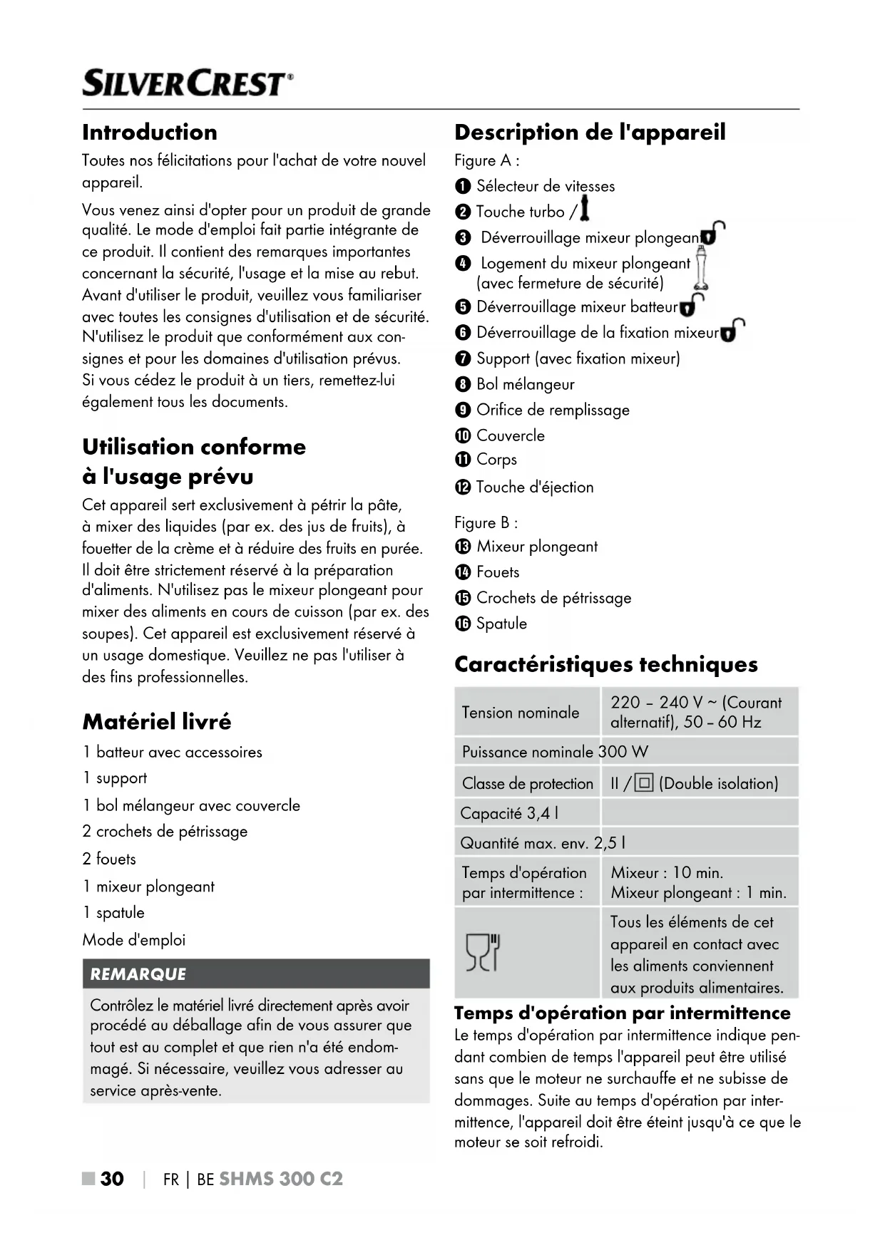Introduction Toutes nos félicitations pour l'achat de votre nouvel appareil. Vous venez ainsi d'opter pour un produit de grande qualité. Le mode d'emploi fait partie intégrante de ce produit. Il contient des remarques importantes concernant la sécurité, l'usage et la mise au rebut. Avant d'utiliser le produit, veuillez vous familiariser avec toutes les consignes d'utilisation et de sécurité. N'utilisez le produit que conformément aux con- signes et pour les domaines d'utilisation prévus. Si vous cédez le produit à un tiers, remettez-lui également tous les documents. Utilisation conforme à l'usage prévu Cet appareil sert exclusivement à pétrir la pâte, à mixer des liquides (parex. des jus de fruits), à fouetter de la crème et à réduire des fruits en purée. Il doit être strictement réservé à la préparation d'aliments. N'utilisez pas le mixeur plongeant pour mixer des aliments en cours de cuisson (par ex. des soupes). Cet appareil est exclusivement réservé à un usage domestique. Veuillez ne pas l'utiliser à des fins professionnelles. Matériel livré 1 batteur avec accessoires 1 support 1 bol mélangeur avec couvercle 2 crochets de pétrissage 2 fouets 1 mixeur plongeant 1 spatule Mode d'emploi REMARQUE Contrôlez le matériel livré directement après avoir procédé au déballage afin de vous assurer que tout est au complet et que rien n'a été endom- magé. Si nécessaire, veuillez vous adresser au service après-vente. Description de l'appareil Figure A: 1 Sélecteur de vitesses 2 Touche turbo / 3 Déverrouillage mixeur plongeant 4 Logement du mixeur plongeant (avec fermeture de sécurité) 5 Déverrouillage mixeur batteur 6 Déverrouillage de la fixation mixeur 7 Support (avec fixation mixeur) 8 Bol mélangeur 9 Orifice de remplissage 0Couvercle q Corps w Touche d'éjection Figure B: e Mixeur plongeant r Fouets t Crochets de pétrissage z Spatule Caractéristiques techniques Tension nominale 220 – 240 V ∼ (Courant alternatif), 50 – 60 Hz Puissance nominale 300W Classe de protection II / (Double isolation) Capacité 3,4 l Quantité max. env. 2,5 l Temps d'opération par intermittence: Mixeur: 10 min. Mixeur plongeant: 1 min. Tous les éléments de cet appareil en contact avec les aliments conviennent aux produits alimentaires. Temps d'opération par intermittence Le temps d'opération par intermittence indique pen- dant combien de temps l'appareil peut être utilisé sans que le moteur ne surchauffe et ne subisse de dommages. Suite au temps d'opération par inter- mittence, l'appareil doit être éteint jusqu'à ce que le moteur se soit refroidi.FR