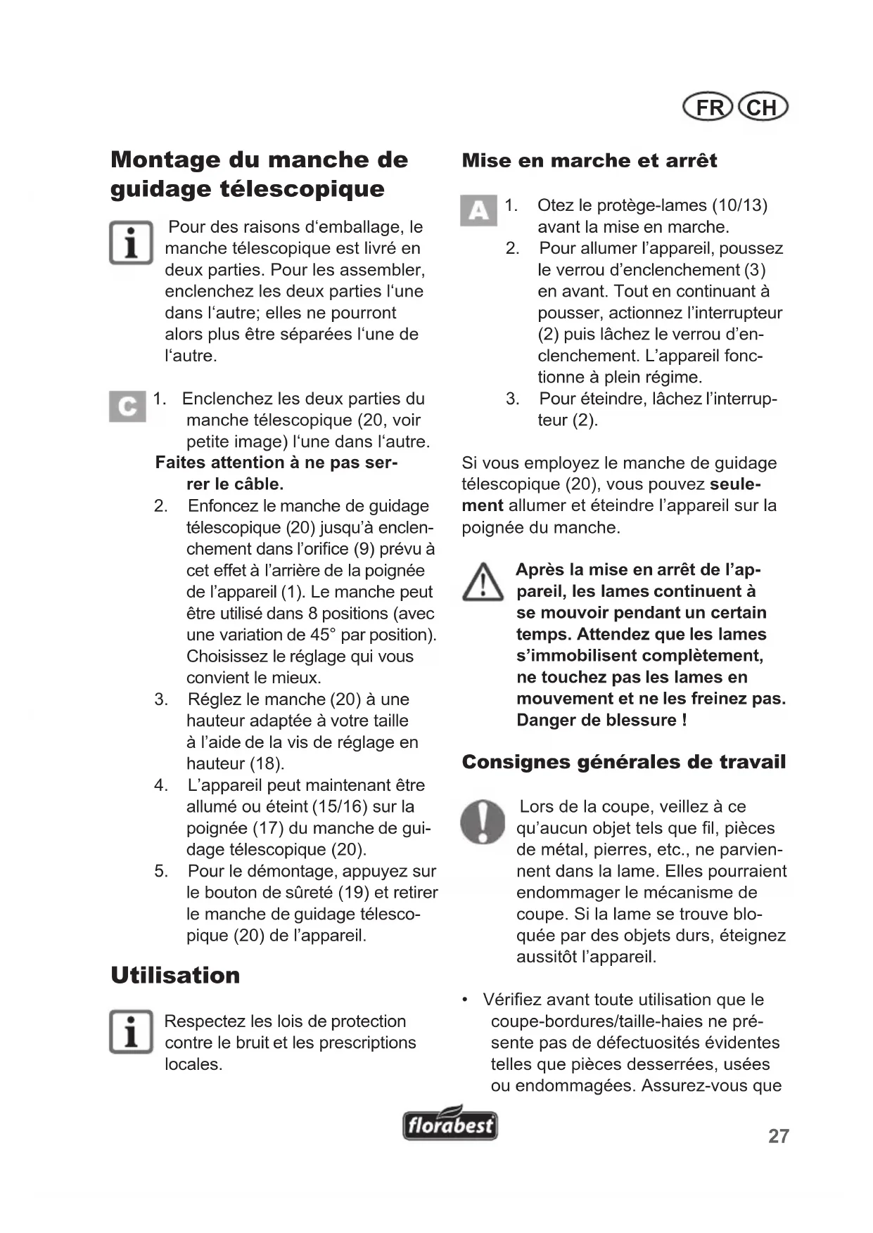 - Nechargezpasdebatterienonrechar- geabledanslechargeur.25 FR CH Fins d’utilisation L’appareilestuniquementdestinéàcouper ettaillerdespoussesmincesdansleshaies, buissonsetarbustesd’ornement,ainsiqu’à couperl’herbepoussantsurlesarêtesetles petitessurfacesdansuncadredomestique. L’appareilestconçupourdesutilisateurs adultes.Lesadolescentsàpartirde16 ansnepeuvents’enservirquesoussur- veillance. Touteautreutilisationquin’estpasexpres- sémentpermisedanscettenoticepeut conduireàendommagerl’appareiletrepré- senterungravedangerpoursonutilisateur. Lapersonnemaniantouutilisantl’appareil estresposabledetoutaccidentoudom- magesubispardestiercespersonnesou parleurpropriété. Lefabricantn’estpasresponsabledes dommagescausésparuneutilisationnon conformeauxprescriptionsouparunma- niementfautif. Description des fonctions Lecoupe-bordure/taille-haieélectriqueest unappareilcombinéàdeuxdispositifsde coupeinterchangeables.Cesdernierssont revêtusdematièreplastiquepourlesproté- gercontrelarouille. Pourlafonctiondetaille-haies,onemploie commemécanismedecoupeunporte- lamesbilatéral.Lorsduprocessusde coupe,lesdentsdelalamesedéplacent dansunmouvementlinérairedeva-et-vient contreuneplaquedetondeusequin’estpas affûtée.Parmesuredesécurité,lescrocs sontarrondiessurlescôtésetplacéesen quinquoncepourlimiterlesdangersde blessure. Pourlafonctiondecoupe-bordures,on emploiecommemécanismedecoupeune lamedetondeusecomportantplusieurs dents.Ellesedéplaceenva-et-vientsurune contre-plaqueelleaussipourvuededents, avecpourrésultatunmouvementdecisaille. Pourpermettreuntravailplusaiséetplus rapide,lecoupe-borduresestéquipéede surcroîtd’unmanchedeguidagetélesco- piqueetderoulettes. Lafonctiondesdifférentsélémentsest exposéeendétailsdanslesdescriptions suivantes. Schéma d’ensemble Voustrouverezaudosle schémadespièceslesplus importantesdel’appareil. 1 Poignéedel’appareil 2 Interrupteur,appareil 3 Verroud’enclenchement,appareil 4 Signaldecharge 5 Rouesavecessieu,xationpar pince 6 Boutond’arrêtpourlamedeci- saillepivotante 7 Accumulateur 8 Prisedecharge 9 Oricepourmanchedeguidage télescopique 10 Protège-lamesdecoupe-bordures 11 Lamedecoupe-bordures 12 Lamedetaille-haies 13 Protège-lamesdetaille-haies 14 Poignéesupplémentaire 15 Verroud’enclenchement,manche télescopique 16 Interrupteur,manchetélescopique 17 Poignée 18 Visderéglageenhauteur 19 Boutondesûreté 20 Manchedeguidagetélescopique (endeuxparties) 21 Chargeur 22 Fichedecâbledecharge