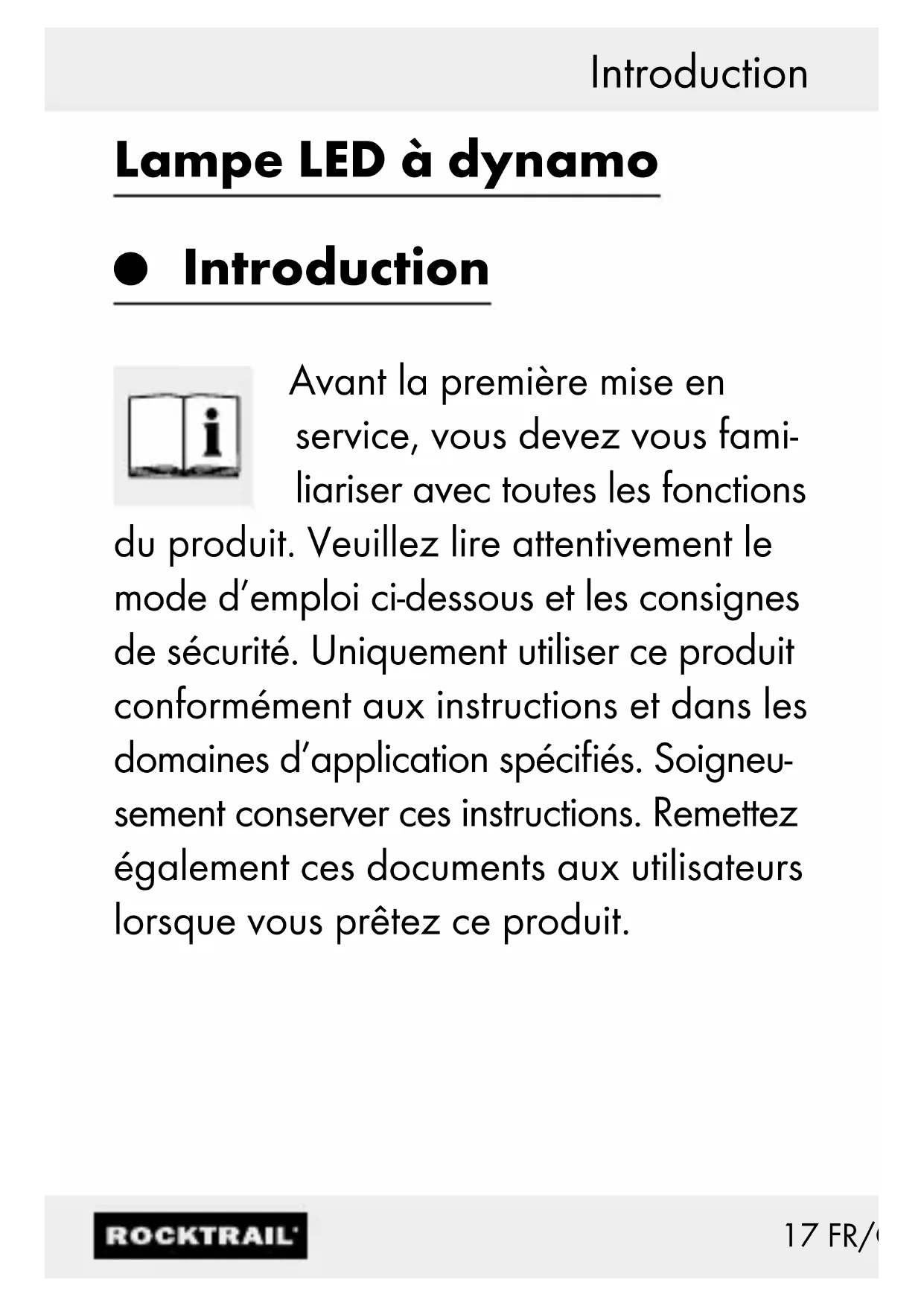 Utilisation conforme à l‘usage prévu Le produit est conçu pour servir de petite source lumineuse mobile disposant de sa propre alimentation en énergie grâce à une manivelle dynamo. Ce produit est destiné à être utilisé à l’intérieur et à l’extérieur. Une autre utilisation que celle décrite ci-dessus ou une modification du produit n‘est pas permise et peut mener à des blessures et / ou à un endommagement du produit. Le fabricant n‘assume aucune responsabilité pour les dommages causés suite à une utilisation contraire à celle décrite. Le produit n‘est pas destiné à l‘utilisation professionnelle.19 FR/CH Introduction