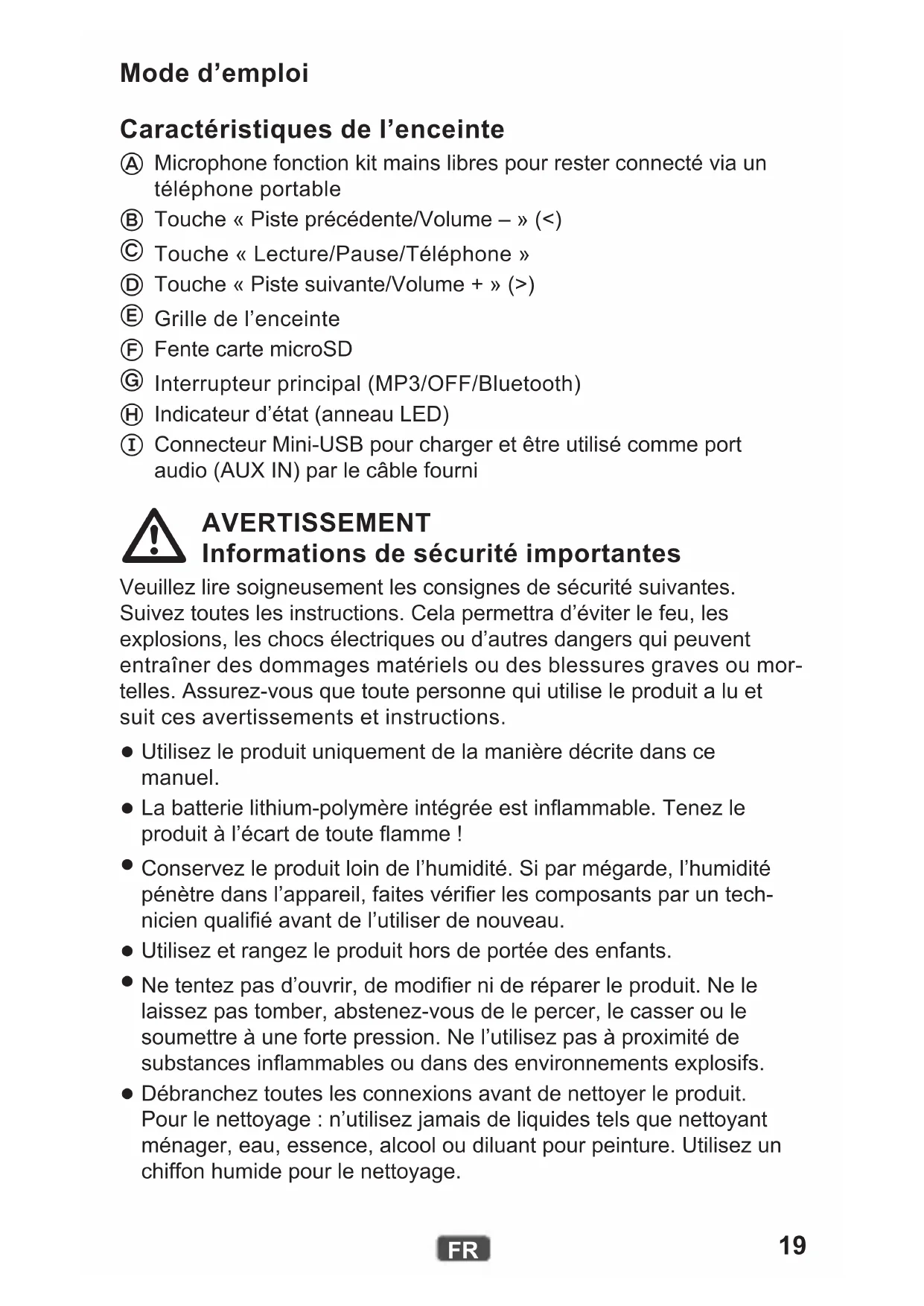 Connecteur Mini-USB pour charger et être utilisé comme port audio (AUX IN) par le câble fourni AVERTISSEMENT Informations de sécurité importantes Veuillez lire soigneusement les consignes de sécurité suivantes. Suivez toutes les instructions. Cela permettra d’éviter le feu, les explosions, les chocs électriques ou d’autres dangers qui peuvent entraîner des dommages matériels ou des blessures graves ou mor- telles. Assurez-vous que toute personne qui utilise le produit a lu et suit ces avertissements et instructions.
