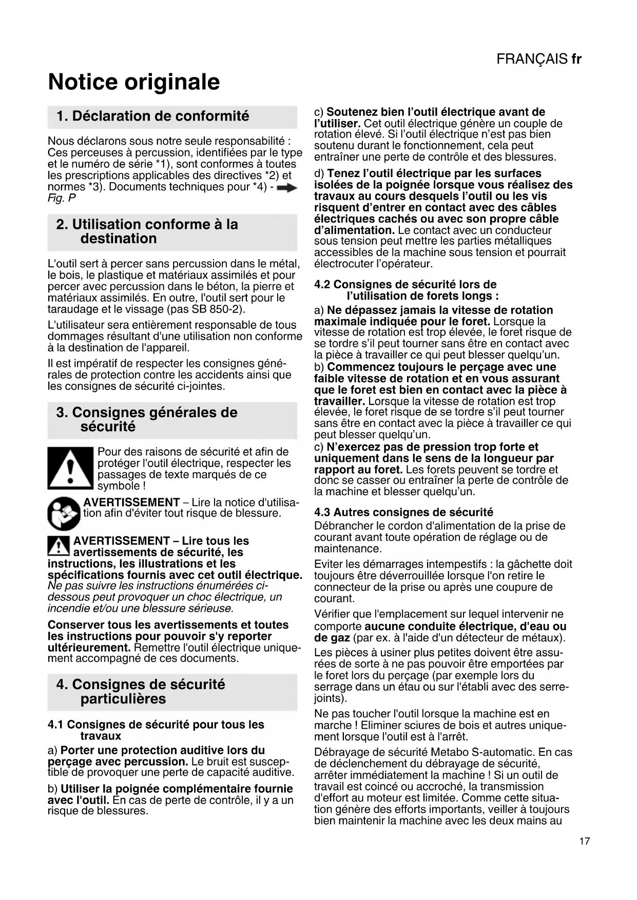 Nous déclarons sous notre seule responsabilité : Ces perceuses à percussion, identifiées par le type et le numéro de série *1), sont conformes à toutes les prescriptions applicables des directives *2) et normes *3). Documents techniques pour *4) - Fig. P