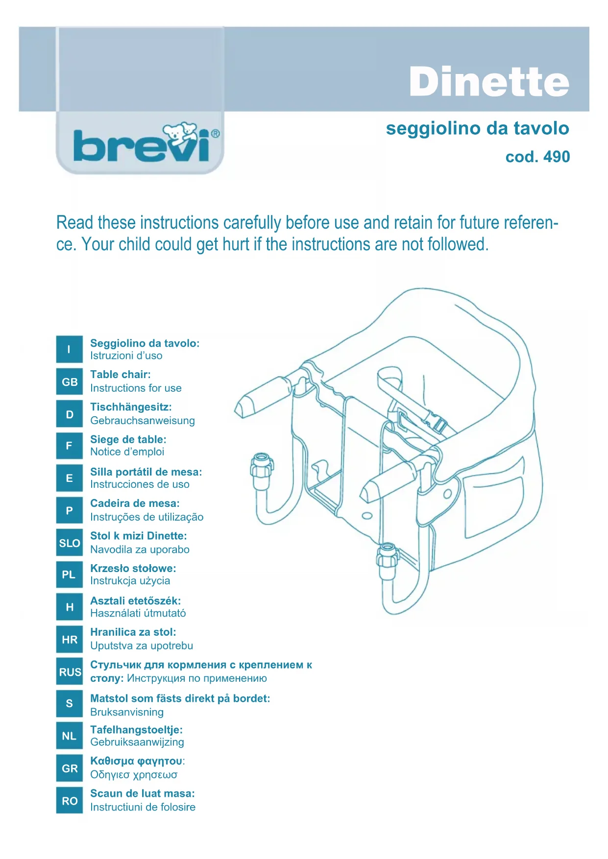 Conforme aux exigences de sécurité Conforme à la norme EN 1272:1998. Le siège de table ne convient pas à un enfant incapable de se tenir assis seul. Ne pas utiliser le siège de table avec des enfants pesant plus de 15 kg. AVERTISSEMENT ! Tenir les emballages à l’écart des enfants pour éviter tout étouffement. AVERTISSEMENT ! Ne jamais laisser l’enfant sans surveillance dans ce siège de table. S’assurer que la table ne basculera pas lorsque le siège y sera fixé et utilisé. Ce siège est adaptable sur le plateau de la table : épaisseur mini 1,8 cm - maxi 6,5 cm (y compris sur table à bandeau). Ne pas utiliser de nappes ou d’éléments de nature à empêcher la fixation correcte du siège sur la table. Régulièrement vérifier les vis et, si nécessaire, les resserrer. AVERTISSEMENT ! Ne pas utiliser le siège de table si certains de ses éléments sont cassés ou man- quants. Ne pas utiliser d’autres pièces de rechange que celles recommandées par le fabricant ou distributeur. Ne pas fixer le siège de table en un endroit où l’enfant pourrait repousser le siège en poussant la table, une autre chaise ou toute autre structure similaire avec ses pieds, car le siège de table pourrait se décrocher de la table. Ne pas utiliser sur une table en verre, sur un dessus de table instable, sur un abattant, sur une table à un pied central, sur une table de jeu ou de camping. ENTRETIEN Suivre les instructions de lavage sur l’étiquette d’entretien présente sur le produit. Maintenir toutes les parties en acier bien sèches afin d’éviter la formation de la rouille. Estimado Cliente, gracias por escoger un producto Brevi. El producto esta homologado según la norma Europea EN 1272:1998. La silla està solamente adaptada para niños que puedan estar sentados solos y que no pesen más de 15 kg. ADVERTENCIA ! Tener lejos del alcance del niño revestimentos o embalajes varios que puedan causar ahogos. ADVERTENCIA ! Nunca dejar al niño sin supervision en la trona portátil de mesa. Verificar siempre que el armazón está bien fijado a la mesa y asegurarse de que sea estable antes de sentar al niño. El asiento puede ser usado sobre mesas con un espesor minimo de 1,8 cm y un máximo de 6,5 cm. No utilizar manteles u otras cosas que puedan impedir el bloqueo correcto del asiento a la mesa. Controlar regularmente los pomos de bloqueo y apretarles si es necesario. ADVERTENCIA ! No usar la silla portátil de mesa si algùn componente falta o está roto. Usar solamente piezas de recambio servidas por el proveedor o distribuidor. No usar la silla donde el niño pueda encontrar un punto de apoyo con los pies (silla, pared, etc) y empujar, arriesgando de desen- ganchar la silla de la mesa. No colocar la silla sobre mesas inestables, mesas de vidrio, o abatibles o bien con pies centrales e mesas de juego o de camping.