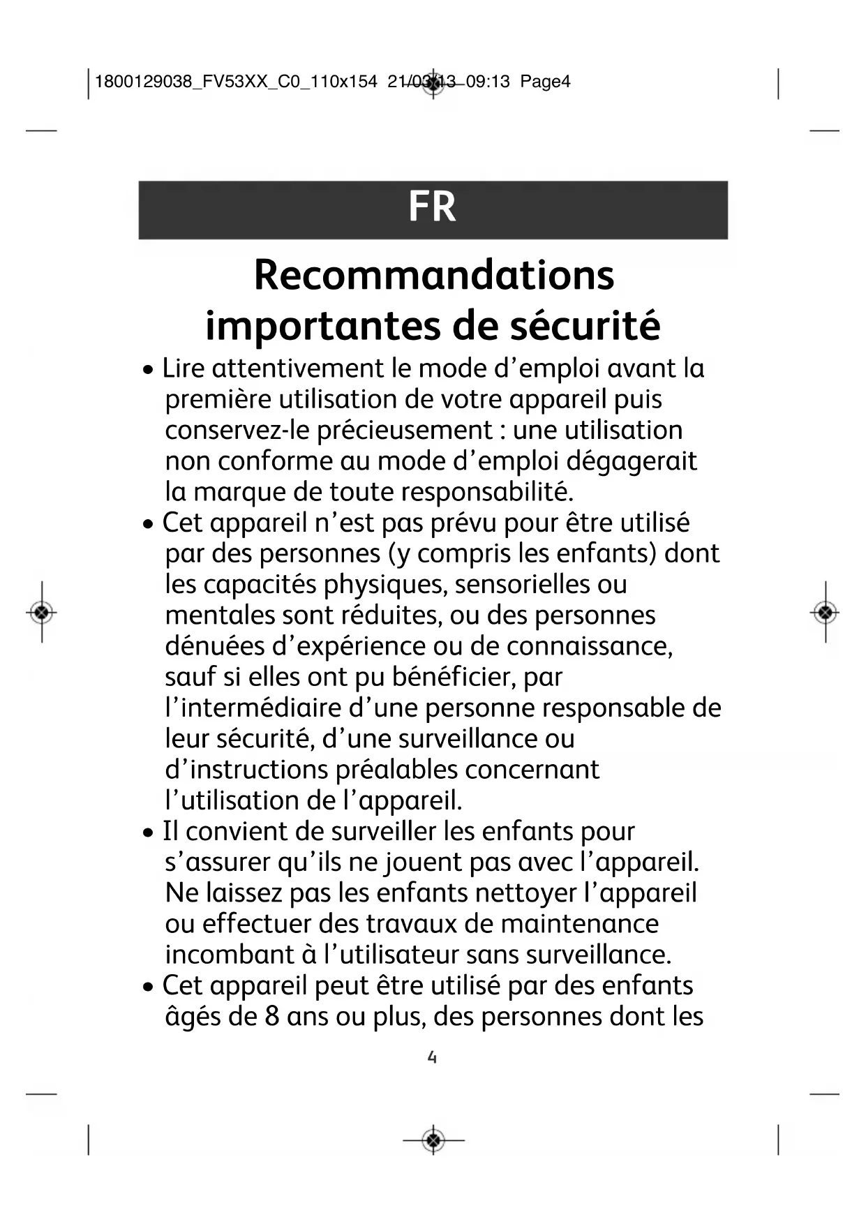 - Ce produit a été conçu pour un usage domestique uniquement. Pour tout usage inapproprié ou contraire aux instructions, la marque décline toute responsabilité et la garantie n’est plus valable. 1800129038_FV53XX_C0_110x154 21/03/13 09:13 Page67
