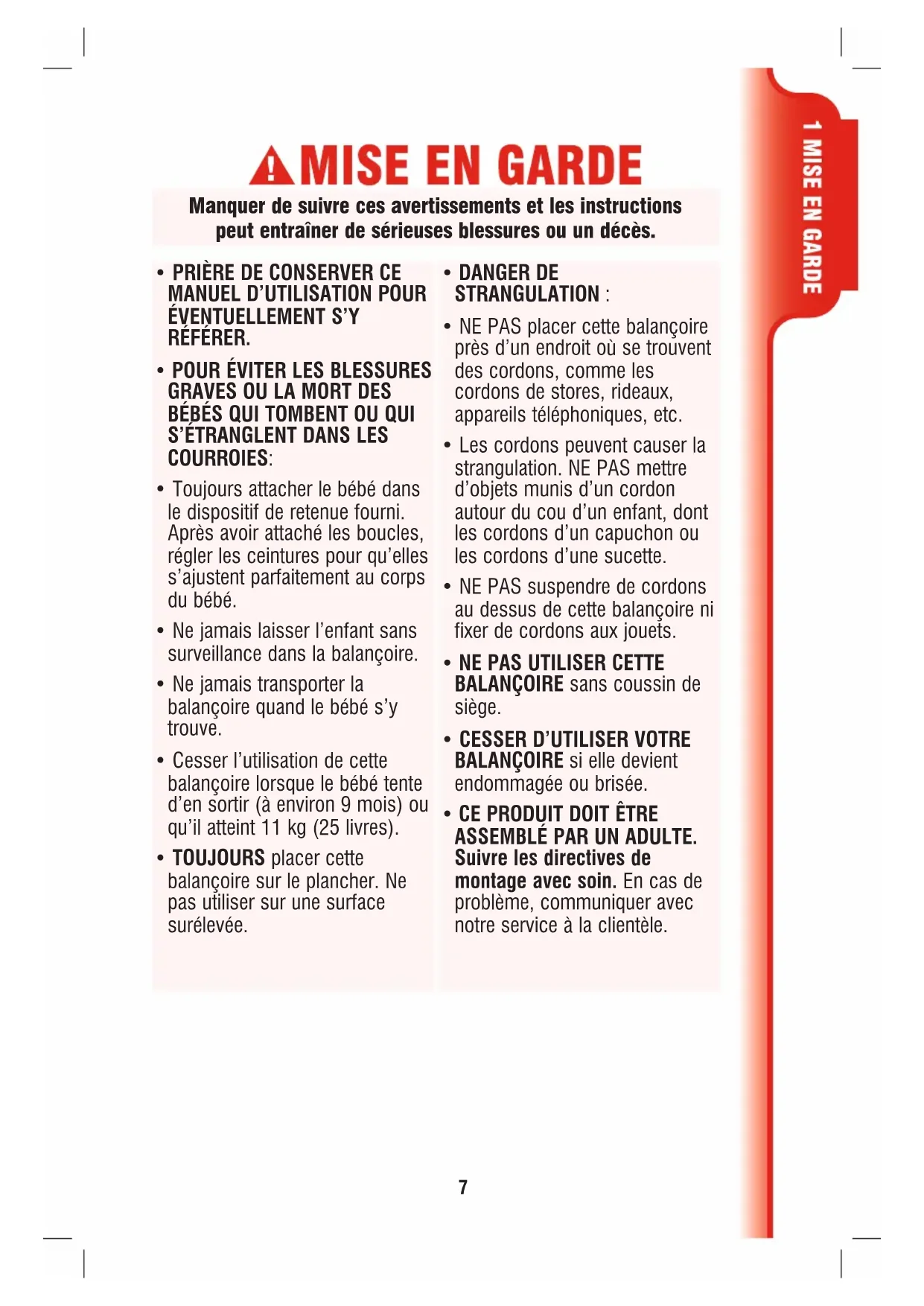 - Les cordons peuvent causer la strangulation. NE PAS mettre d’objets munis d’un cordon autour du cou d’un enfant, dont les cordons d’un capuchon ou les cordons d’une sucette.