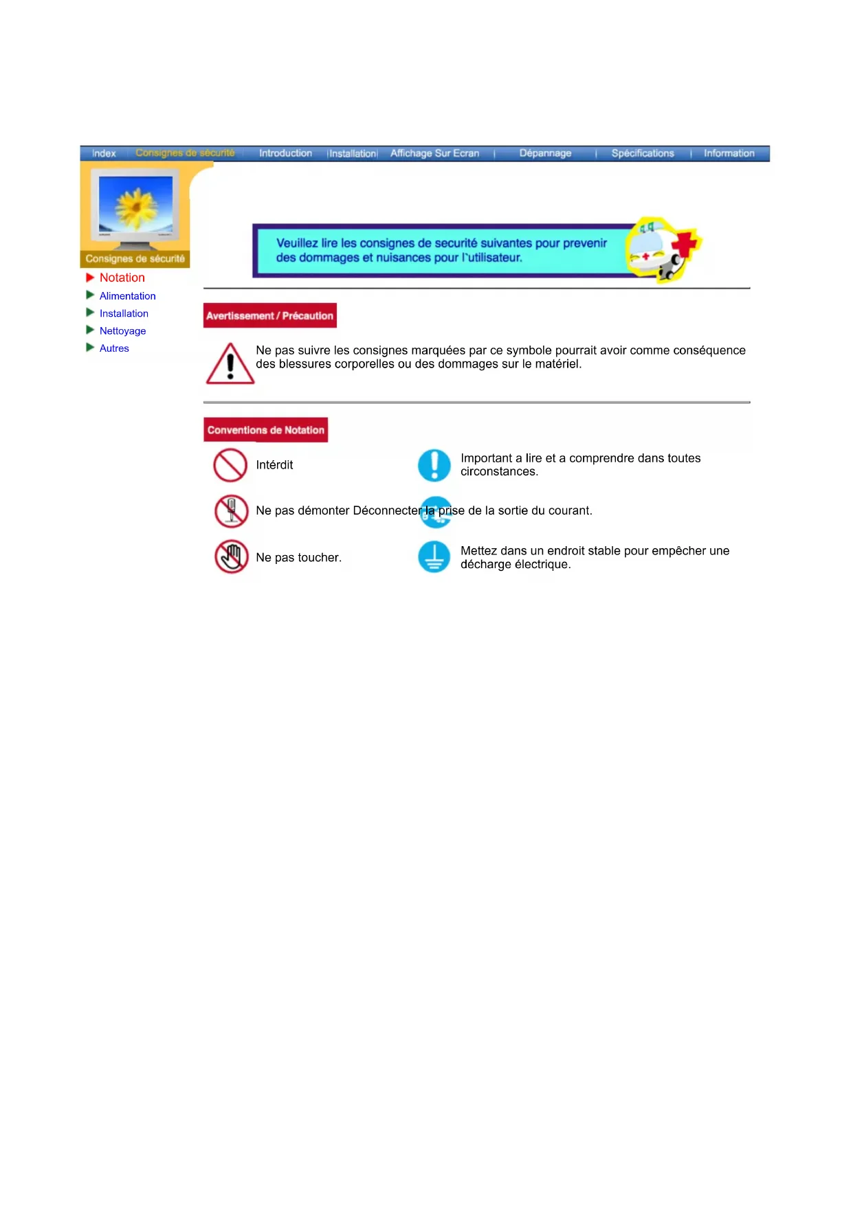 SyncMaster 181T/191T/171T/171S/171V/191N/170N/172N/192N/173N/193NNotation Alimentation Installation Nettoyage Autres Ne pas suivre les consignes marquées par ce symbole pourrait avoir comme conséquence des blessures corporelles ou des dommages sur le matériel. Intérdit Important a lire et a comprendre dans toutes circonstances. Ne pas démonter Déconnecter la prise de la sortie du courant. Ne pas toucher. Mettez dans un endroit stable pour empêcher une décharge électrique.Notation Alimentation Installation Nettoyage Autres Lorsque vous ne vous en êtes pas servi depuis longtemps, placez votre ordinateur personnel (Pc) en mode DPMS. Si vous avez un économiseur d'écran, installez-le pour activer le mode d' écran. Ne pas utiliser une prise endommagée ou desserrée.