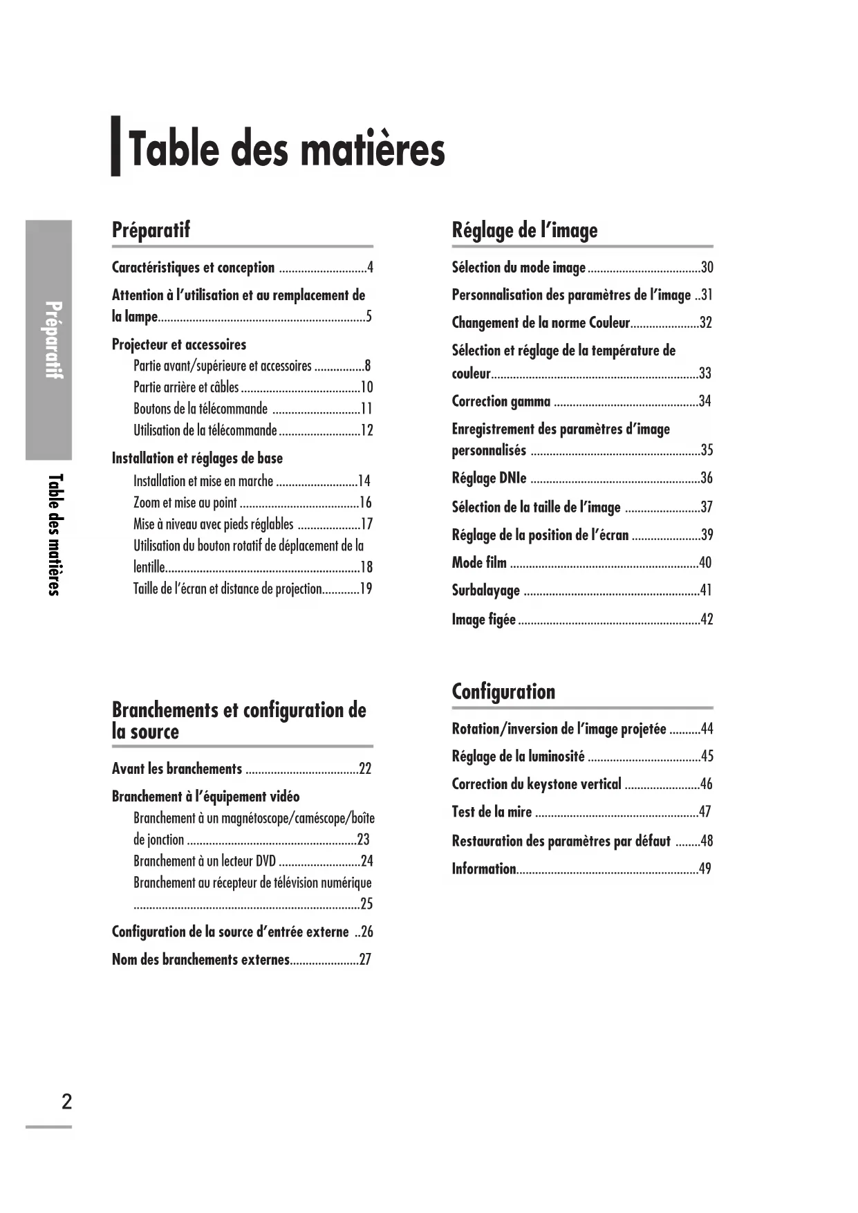 - Attention à l’utilisation et au remplacement de la lampe p. 5