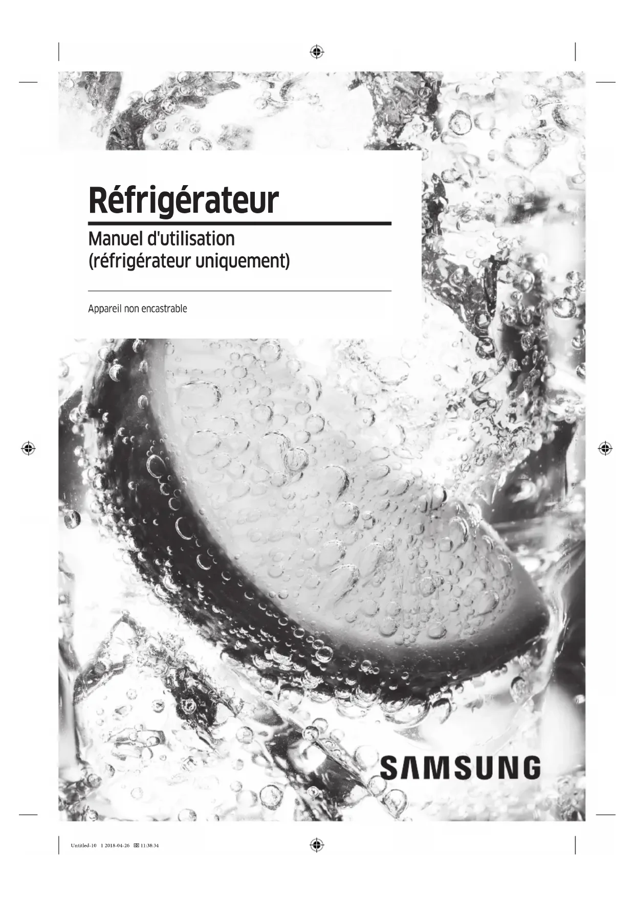 www.samsung.com/levant/support SYRIA 962 5777444 Lebanon 1299 Iraq 80010080 MOROCCO 080 100 22 55 www.samsung.com/n_africa/support SAUDI ARABIA (+966) 8002474357 (800 24/7 HELP) www.samsung.com/sa/home www.samsung.com/sa_en DA68-03560J-03 Untitled-8 68 2018-04-26 11:23:41Réfrigérateur Manuel d'utilisation (réfrigérateur uniquement) Appareil non encastrable Untitled-10 1 2018-04-26 11:38:34Français2 Sommaire Sommaire Consignes de sécurité 3 Consignes de sécurité importantes et symboles : 5 Symboles d'avertissement importants concernant le transport et le lieu d'installation de l'appareil 6 Avertissements importants concernant l'installation 6 Installation en toute sécurité 11 Avertissements importants concernant l'utilisation 12 Avertissement relatif à l'utilisation 17 Utilisation en toute sécurité 18 Nettoyage en toute sécurité 20 Avertissements importants concernant la mise au rebut 22 Conseils complémentaires pour une utilisation appropriée 23 Conseils en matière d'économie d'énergie 24 Cet appareil est destiné à être utilisé dans les applications domestiques et similaires telles que : 25 Instructions concernant la règlementation DEEE 25 Installation 26 Présentation rapide du réfrigérateur 26 Installation étape par étape 27 Opérations 34 Panneau de commande 34 Samsung Smart Home 38 Fonctions spéciales 40 Entretien 42 Inversion de la porte (modèles applicables uniquement) 42 Utilisation et entretien 60 Nettoyage 61 Remplacement 61 Installation côte à côte 62 Dépannage 65 Généralités 65 Entendez-vous des sons anormaux provenant du réfrigérateur ? 67 Samsung Smart Home 69 Untitled-10 2 2018-04-26 11:38:34Français 3 Consignes de sécurité