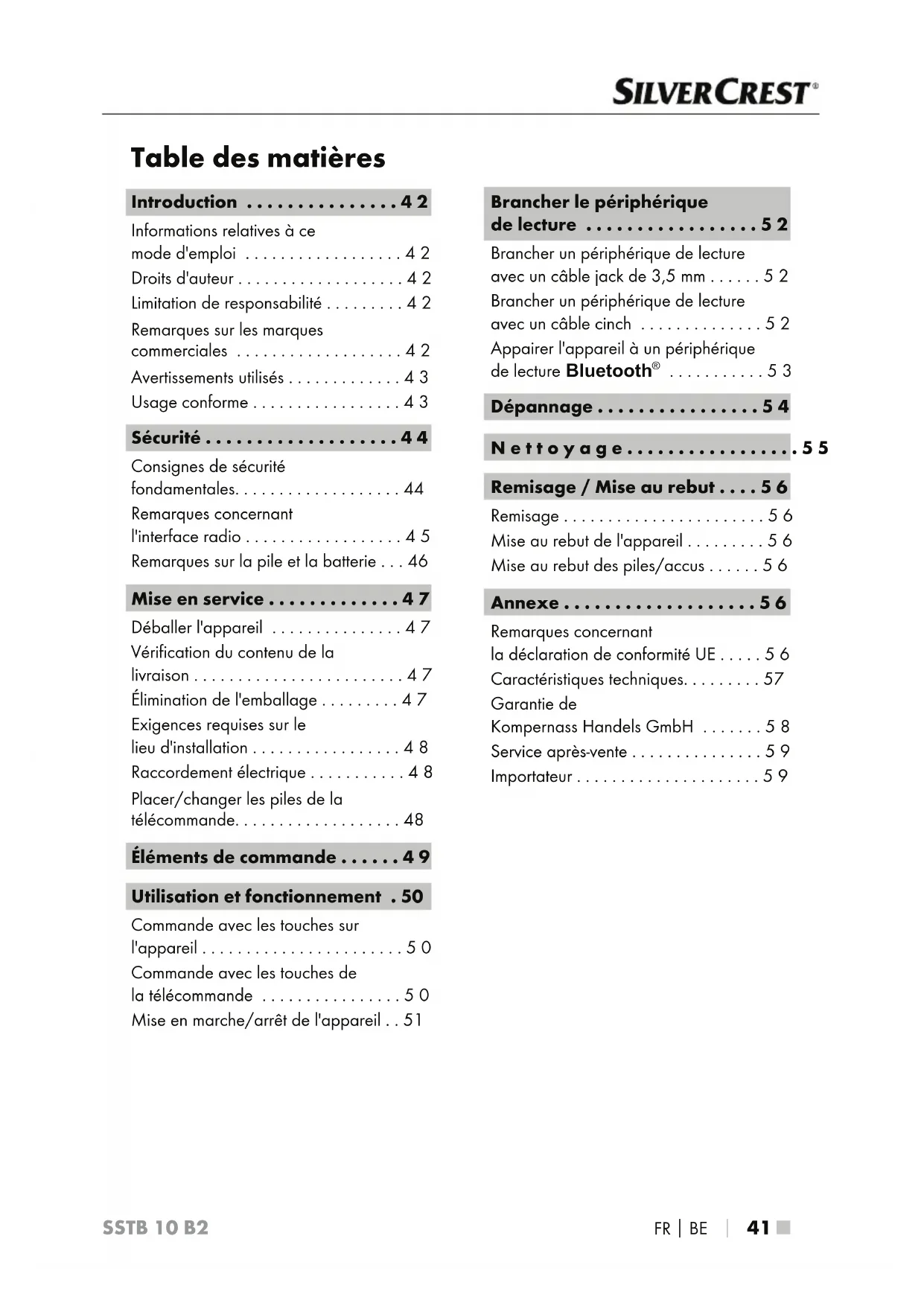 55 ■ SSTB 10 B2 Panne Cause possible Remède La télécommande ne fonctionne pas. Mauvais alignement de la télécommande. Orientez la télécommande sur le capteur infrarouge sur l'avant de l'appareil. La distance entre l'appa- reil et la télécommande est trop importante. Réduisez la distance entre la télécom- mande et l'appareil. Les piles de la télécom- mande sont vides. Changez les piles. REMARQUE ► Si vous ne réussissez pas à résoudre le problème à l'aide des mesures précitées, veuillez vous adresser au service après-vente. Nettoyage DANGER Danger de mort par électrocution! ► Débranchez l'adaptateur secteur de la prise, avant de commencer le nettoyage. ATTENTION! Endommagement de l'appareil! ► Lors du nettoyage de l'appareil, veillez à ce qu'aucune humidité ne pénètre dans ce dernier afin d'éviter tous dégâts irréparables. ► N'utilisez pas de produits nettoyants abrasifs ou agressifs ou contenant des solvants. Ils peuvent en effet endommager les surfaces de l'appareil. ♦ Nettoyez les surfaces de l’appareil à l’aide d’un chiffon doux et sec. En cas de salissures coriaces, utilisez un chiffon légèrement humide avec un produit de nettoyage doux.■ 56