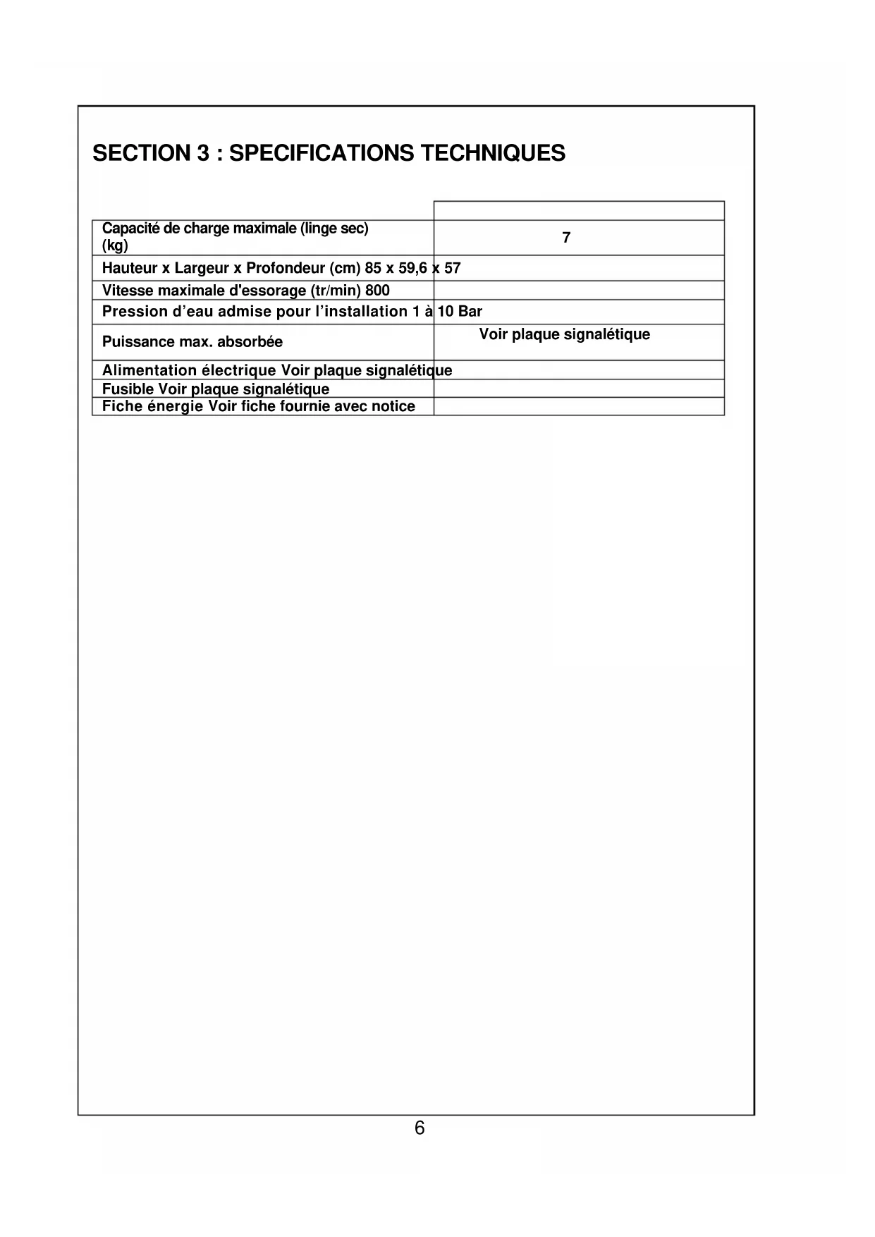 SECTION 3 : SPECIFICATIONS TECHNIQUES...... Page 6