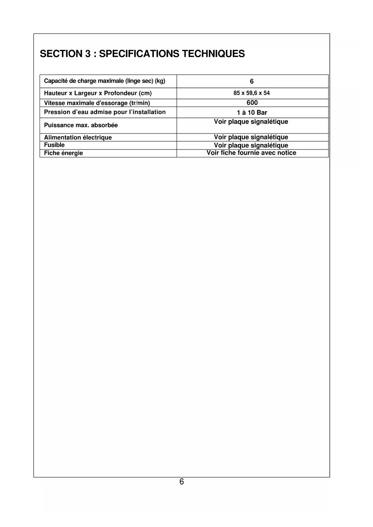 SECTION 3 : SPECIFICATIONS TECHNIQUES