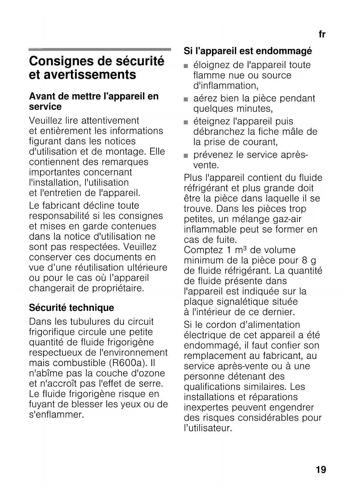 frTable des matières frMode d’emploi Consignes de sécurité et avertissements Avant de mettre l'appareil en service Veuillez lire attentivement et entièrement les informations figurant dans les notices d'utilisation et de montage. Elle contiennent des remarques importantes concernant l'installation, l'utilisation et l'entretien de l'appareil. Le fabricant décline toute responsabilité si les consignes et mises en garde contenues dans la notice d'utilisation ne sont pas respectées. Veuillez conserver ces documents en vue d’une réutilisation ultérieure ou pour le cas où l’appareil changerait de propriétaire. Sécurité technique Dans les tubulures du circuit frigorifique circule une petite quantité de fluide frigorigène respectueux de l'environnement mais combustible (R600a). Il n'abîme pas la couche d'ozone et n'accroît pas l'effet de serre. Le fluide frigorigène risque en fuyant de blesser les yeux ou de s'enflammer. Si l'appareil est endommagé ■ éloignez de l'appareil toute flamme nue ou source d'inflammation, ■ aérez bien la pièce pendant quelques minutes, ■ éteignez l'appareil puis débranchez la fiche mâle de la prise de courant, ■ prévenez le service après- vente. Plus l'appareil contient du fluide réfrigérant et plus grande doit être la pièce dans laquelle il se trouve. Dans les pièces trop petites, un mélange gaz-air inflammable peut se former en cas de fuite. Comptez 1 m³ de volume minimum de la pièce pour 8 g de fluide réfrigérant. La quantité de fluide présente dans l'appareil est indiquée sur la plaque signalétique située à l'intérieur de ce dernier. Si le cordon d’alimentation électrique de cet appareil a été endommagé, il faut confier son remplacement au fabricant, au service après-vente ou à une personne détenant des qualifications similaires. Les installations et réparations inexpertes peuvent engendrer des risques considérables pour l’utilisateur.fr