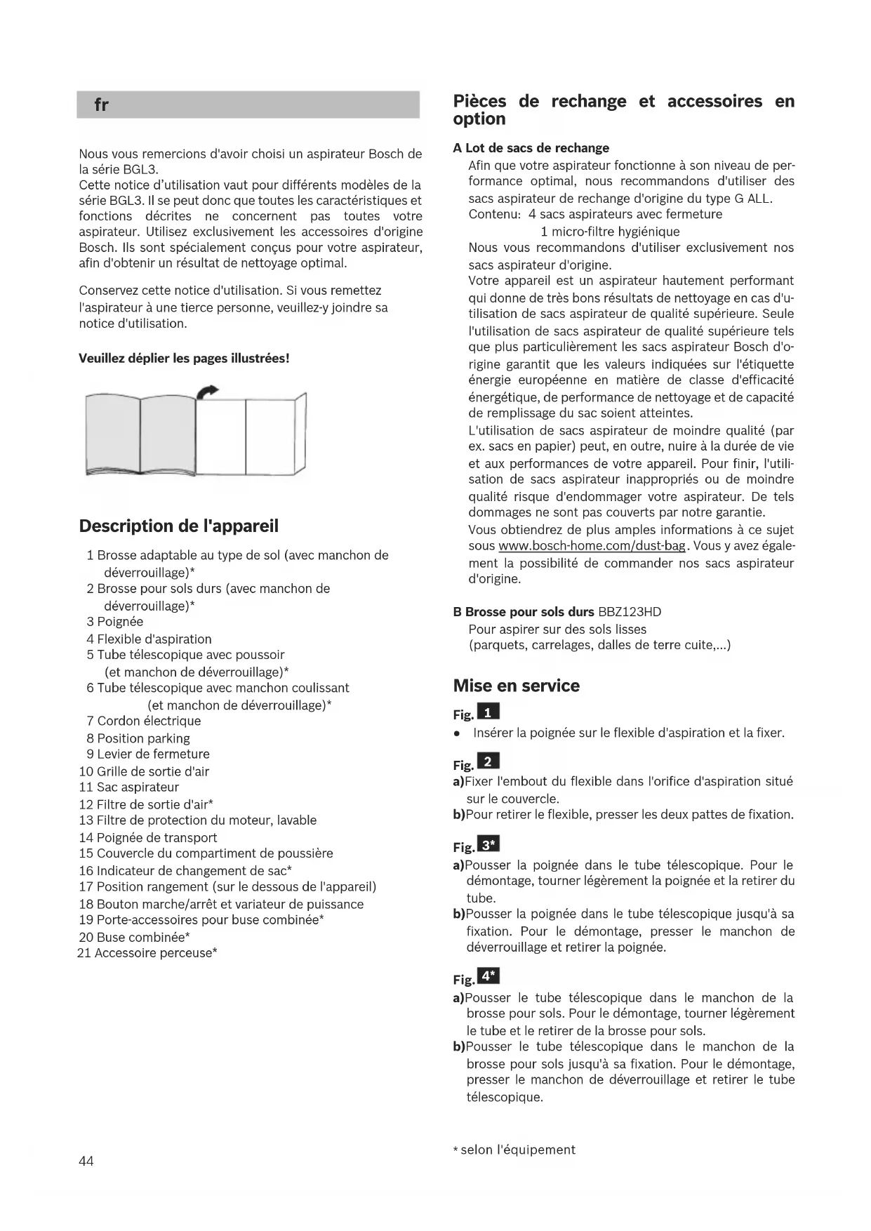 depending on model44 Nous vous remercions d'avoir choisi un aspirateur Bosch de la série BGL3. Cette notice d’utilisation vaut pour différents modèles de la série BGL3. Il se peut donc que toutes les caractéristiques et fonctions décrites ne concernent pas toutes votre aspirateur. Utilisez exclusivement les accessoires d'origine Bosch. Ils sont spécialement conçus pour votre aspirateur, afin d'obtenir un résultat de nettoyage optimal. Conservez cette notice d'utilisation. Si vous remettez l'aspirateur à une tierce personne, veuillez-y joindre sa notice d'utilisation. Veuillez déplier les pages illustrées! Description de l'appareil 1 Brosse adaptable au type de sol (avec manchon de déverrouillage)* 2 Brosse pour sols durs (avec manchon de déverrouillage)* 3 Poignée 4 Flexible d'aspiration 5 Tube télescopique avec poussoir (et manchon de déverrouillage)* 6 Tube télescopique avec manchon coulissant (et manchon de déverrouillage)* 7 Cordon électrique 8 Position parking 9 Levier de fermeture 10 Grille de sortie d'air 11 Sac aspirateur 12 Filtre de sortie d'air* 13 Filtre de protection du moteur, lavable 14 Poignée de transport 15 Couvercle du compartiment de poussière 16 Indicateur de changement de sac* 17 Position rangement (sur le dessous de l'appareil) 18 Bouton marche/arrêt et variateur de puissance 19 Porte-accessoires pour buse combinée* 20 Buse combinée* 21 Accessoire perceuse* Pièces de rechange et accessoires en option A Lot de sacs de rechange Afin que votre aspirateur fonctionne à son niveau de per- formance optimal, nous recommandons d'utiliser des sacs aspirateur de rechange d'origine du type G ALL. Contenu: 4 sacs aspirateurs avec fermeture 1 micro-filtre hygiénique Nous vous recommandons d'utiliser exclusivement nos sacs aspirateur d'origine. Votre appareil est un aspirateur hautement performant qui donne de très bons résultats de nettoyage en cas d'u- tilisation de sacs aspirateur de qualité supérieure. Seule l'utilisation de sacs aspirateur de qualité supérieure tels que plus particulièrement les sacs aspirateur Bosch d'o- rigine garantit que les valeurs indiquées sur l'étiquette énergie européenne en matière de classe d'efficacité énergétique, de performance de nettoyage et de capacité de remplissage du sac soient atteintes. L'utilisation de sacs aspirateur de moindre qualité (par ex. sacs en papier) peut, en outre, nuire à la durée de vie et aux performances de votre appareil. Pour finir, l'utili- sation de sacs aspirateur inappropriés ou de moindre qualité risque d'endommager votre aspirateur. De tels dommages ne sont pas couverts par notre garantie. Vous obtiendrez de plus amples informations à ce sujet sous www.bosch-home.com/dust-bag . Vous y avez égale- ment la possibilité de commander nos sacs aspirateur d'origine. B Brosse pour sols durs BBZ123HD Pour aspirer sur des sols lisses (parquets, carrelages, dalles de terre cuite,...) Mise en service Fig. ● Insérer la poignée sur le flexible d'aspiration et la fixer. Fig. a)Fixer l'embout du flexible dans l'orifice d'aspiration situé sur le couvercle. b)Pour retirer le flexible, presser les deux pattes de fixation. Fig. a)Pousser la poignée dans le tube télescopique. Pour le démontage, tourner légèrement la poignée et la retirer du tube. b)Pousser la poignée dans le tube télescopique jusqu'à sa fixation. Pour le démontage, presser le manchon de déverrouillage et retirer la poignée. Fig. a)Pousser le tube télescopique dans le manchon de la brosse pour sols. Pour le démontage, tourner légèrement le tube et le retirer de la brosse pour sols. b)Pousser le tube télescopique dans le manchon de la brosse pour sols jusqu'à sa fixation. Pour le démontage, presser le manchon de déverrouillage et retirer le tube télescopique.