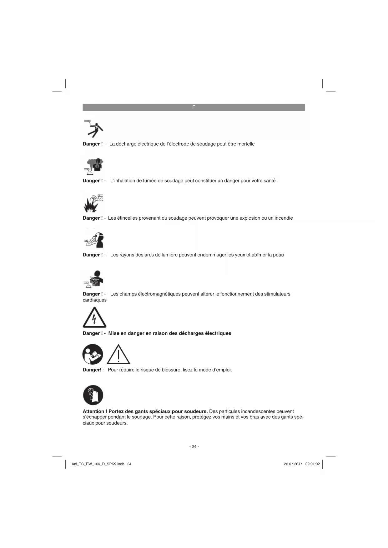 Danger ! - La décharge électrique de l’électrode de soudage peut être mortelle Danger ! - L’inhalation de fumée de soudage peut constituer un danger pour votre santé Danger ! - Les rayons des arcs de lumière peuvent endommager les yeux et abîmer la peau Danger ! - Les étincelles provenant du soudage peuvent provoquer une explosion ou un incendie Danger ! - Les champs électromagnétiques peuvent altérer le fonctionnement des stimulateurs cardiaques Danger ! - Mise en danger en raison des décharges électriques Danger! - Pour réduire le risque de blessure, lisez le mode d’emploi. Attention ! Portez des gants spéciaux pour soudeurs. Des particules incandescentes peuvent s’échapper pendant le soudage. Pour cette raison, protégez vos mains et vos bras avec des gants spé- ciaux pour soudeurs. Anl_TC_EW_160_D_SPK9.indb 24Anl_TC_EW_160_D_SPK9.indb 24 26.07.2017 09:01:0226.07.2017 09:01:02F