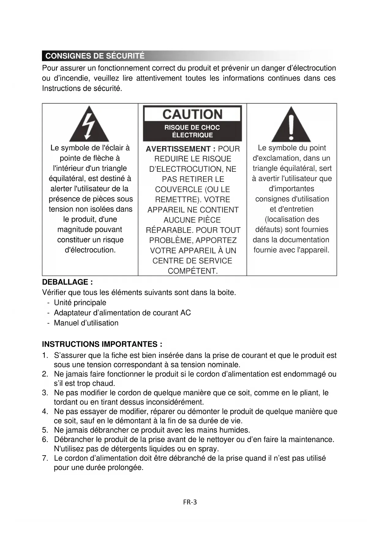 AVERTISSEMENT : POUR REDUIRE LE RISQUE D'ELECTROCUTION, NE PAS RETIRER LE COUVERCLE (OU LE REMETTRE). VOTRE APPAREIL NE CONTIENT AUCUNE PIÈCE RÉPARABLE. POUR TOUT PROBLÈME, APPORTEZ VOTRE APPAREIL À UN CENTRE DE SERVICE COMPÉTENT.