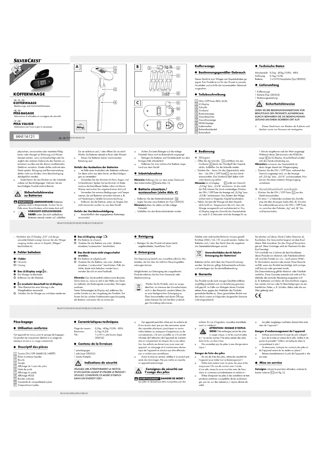 Vano portabatterie ce produit au vendeur. La présente garantie ne constitue pas une restriction de vos droits légaux. Cet appareil dispose d‘une garantie de 3 ans à partir de la date d‘achat. La période de garantie débute à la date d’achat. Veuillez conserver le ticket de caisse original. Il fera office de preuve d’achat. Si un problème matériel ou de fabrication devait sur- venir dans les 3ans suivant la date d‘achat du produit, nous assurons à notre discrétion la réparation ou le remplacement de l‘appareil sans frais supplémentaires. La garantie prend fin si le produit est endommagé suite à une utilisation inappropriée ou à un manque d‘entretien. La garantie couvre les vices matériels et de fabrication. Cette garantie ne s’étend pas aux pièces du produit soumises à une usure normale (par ex. des piles) et qui, par conséquent, peuvent être considérées comme des pièces d’usure, ni aux dommages sur des compo- sants fragiles, comme des interrupteurs, des batteries et des éléments fabriqués en verre. des points de collecte et de leurs horaires d’ouverture. Les piles défectueuses ou usagées doivent être recy- clées conformément à la directive 2006 / 66 / CE. Les piles et / ou l‘appareil doivent être retournés dans les centres de collecte. Pollution de l’environnement causée par une mise au rebut incorrecte des piles ! Les piles ne doivent pas être mises au rebut dans les ordures ménagères. Elles peuvent contenir des mé- taux lourds toxiques et doivent être considérées comme des déchets spéciaux. Garantie L’appareil a été fabriqué selon des critères de qualité stricts et contrôlé consciencieusement avant sa livraison. En cas de défaillance, vous êtes en droit de retourner L‘écran LCD affiche . La pile est faible. Remplacez la pile comme indiqué sous „Insérer / remplacer la pile“. L‘appareil ne peut pas être mis en marche. La pile est usée. Remplacez la pile comme décrit sous „Insérer / remplacer la pile“. Si cela ne permet pas de cor- riger l‘erreur, faites appel à un spécialiste. Remarque: cet appareil contient des composants électroniques. Des interférences sont donc possibles à proximité d‘appareils émettant des signaux radio. En cas d’affichages erronés sur l’écran, éloignez ces appareils de l’environnement du produit. En cas de dysfonctionnements de ce type, retirez la pile pen- dant quelques instants et remettez-la en place. touche ON- / OFF pour alterner entre les unités „kg“ et „lb“. Une fois que l‘écran LCD affiche „0,0” et l‘unité souhaitée, vous pouvez débuter la pesée de la façon décrite dans le chapitre „Peser“. Problèmes et solutions = Erreur = Cause = Solution L‘écran LCD affiche . La balance est surchargée. Éliminez la surcharge. s‘affiche durablement sur l‘écran LCD. Une surcharge a entraîné un dysfonctionnement de la fonction de pesage. Éteignez la balance puis rallumez-la. Soulevez maintenant légèrement la balance avec le bagage. Assurez-vous que la balance est à l‘horizontale et équilibrée. L‘écran LCD indique le poids du bagage. Après 2 à 3secondes, l‘affichage se fige et la valeur reste affichée pendant env. 1minute. Pendant ce temps, l‘affichage HOLD