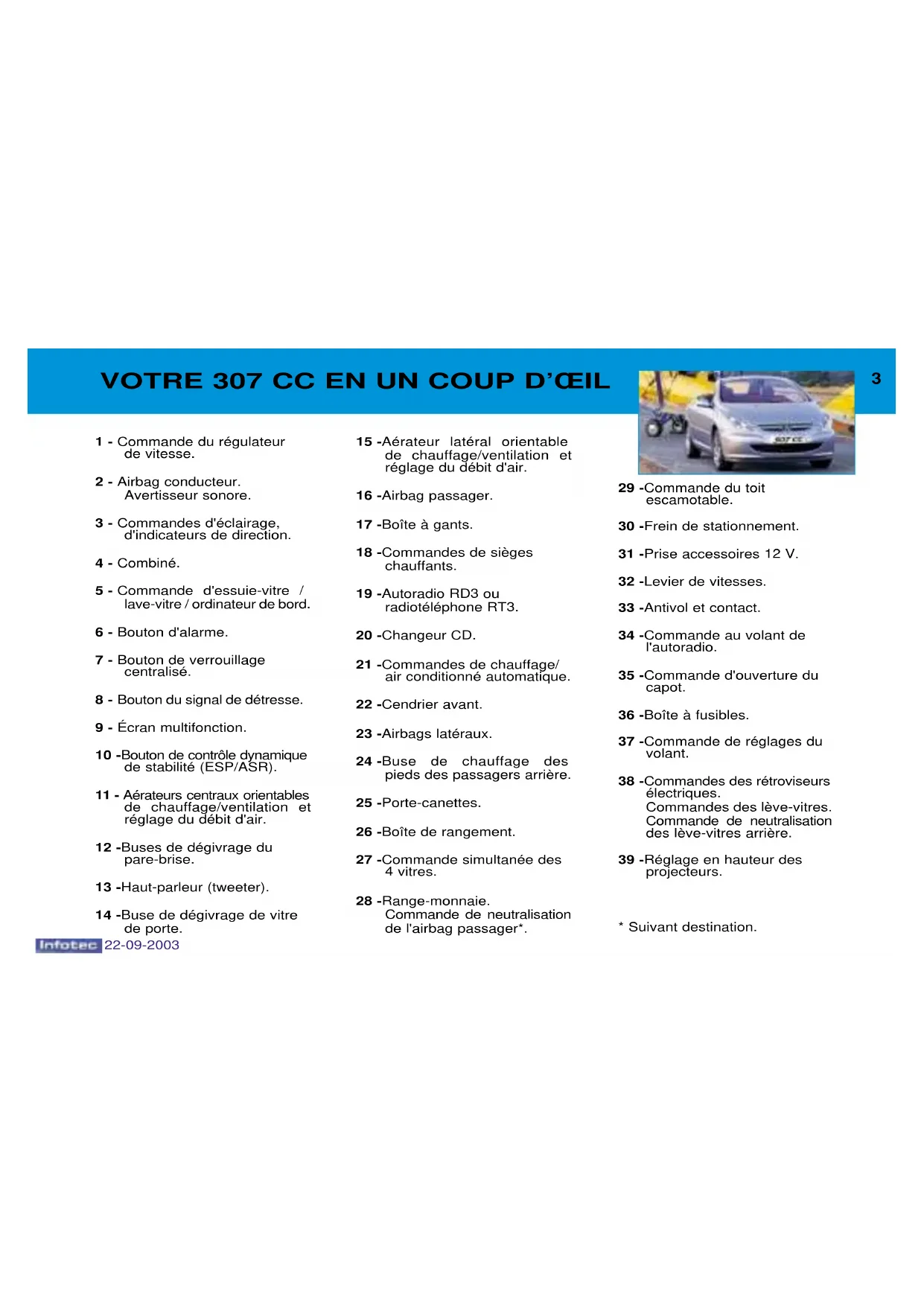 Pages Sièges 84 - 91 Commandes au volant 102 - 108 Toit escamotable 100 - 101 Combinés 28 - 29 Ventilation, air conditionné 80 - 83 Pages Vérifications 127 - 131 Ouvertures 92 - 99 Trappe à carburant 99 Changer une lampe 135 - 137 Changer une roue 132 - 134 Chaque modèle peut ne reprendre qu'une partie des équipements mentionnés selon le niveau de finition et les caractéristiques propres au pays où il est commercialisé. 22-09-20032 VOTRE 307 CC EN UN COUP D’ŒIL 22-09-20033 VOTRE 307 CC EN UN COUP D’ŒIL