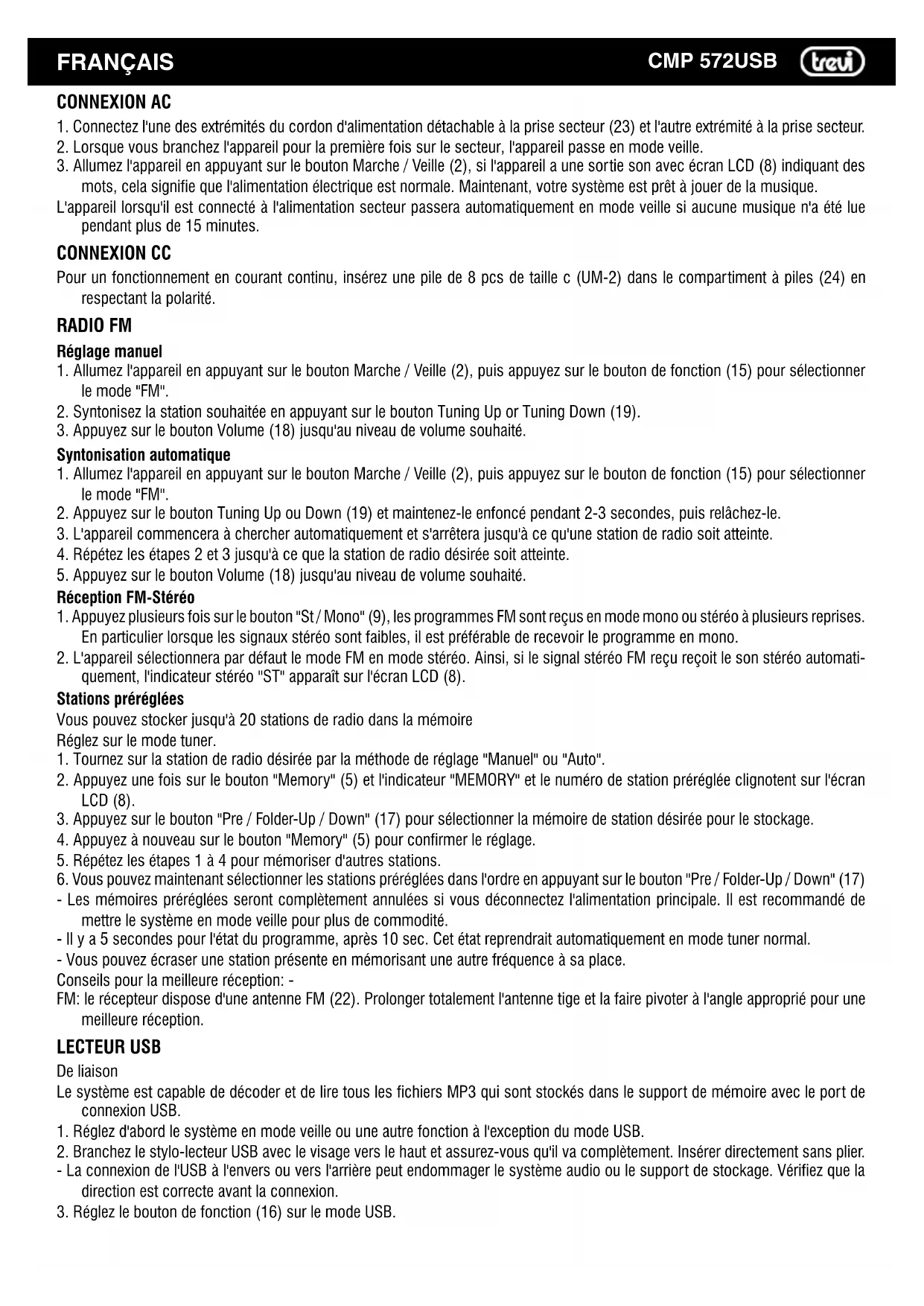 CMP 572USB FRANÇAIS 4. Le système commence à lire le support de stockage après la connexion et démarre la lecture automatiquement, et l'écran LCD (8) affichera le numéro de la piste et la durée de la lecture.