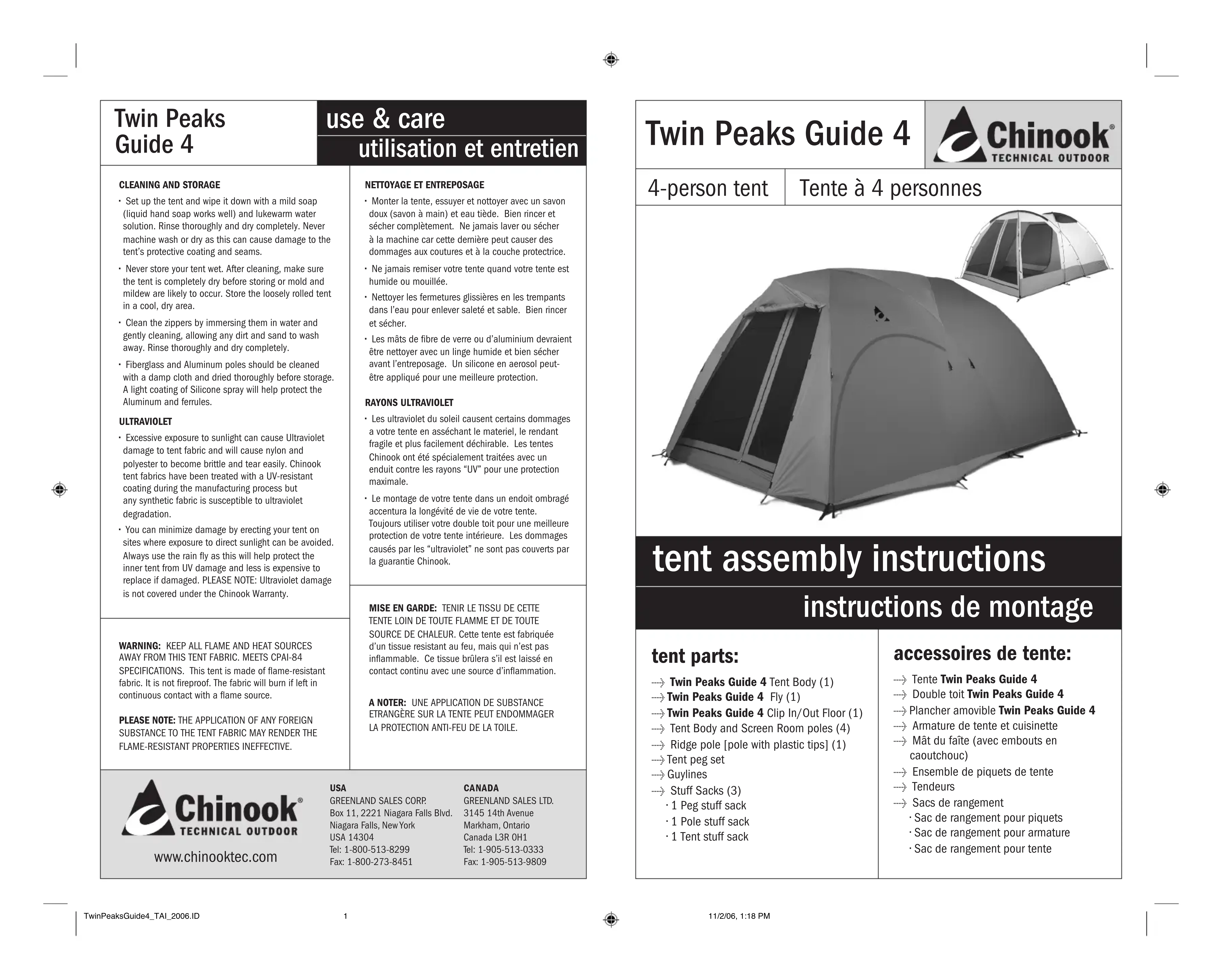 Merci pour l'achat de nouvelle tentative Chinook. Nous avons dessiné et fabriqu nos tentes pour vous donner des années de plaisir sans faux de tête. Pour maximiser votre plaisir, s.x.p. line attentivement les instructions de montage et de soins à prendre pour conserver cette tente enonne condition.