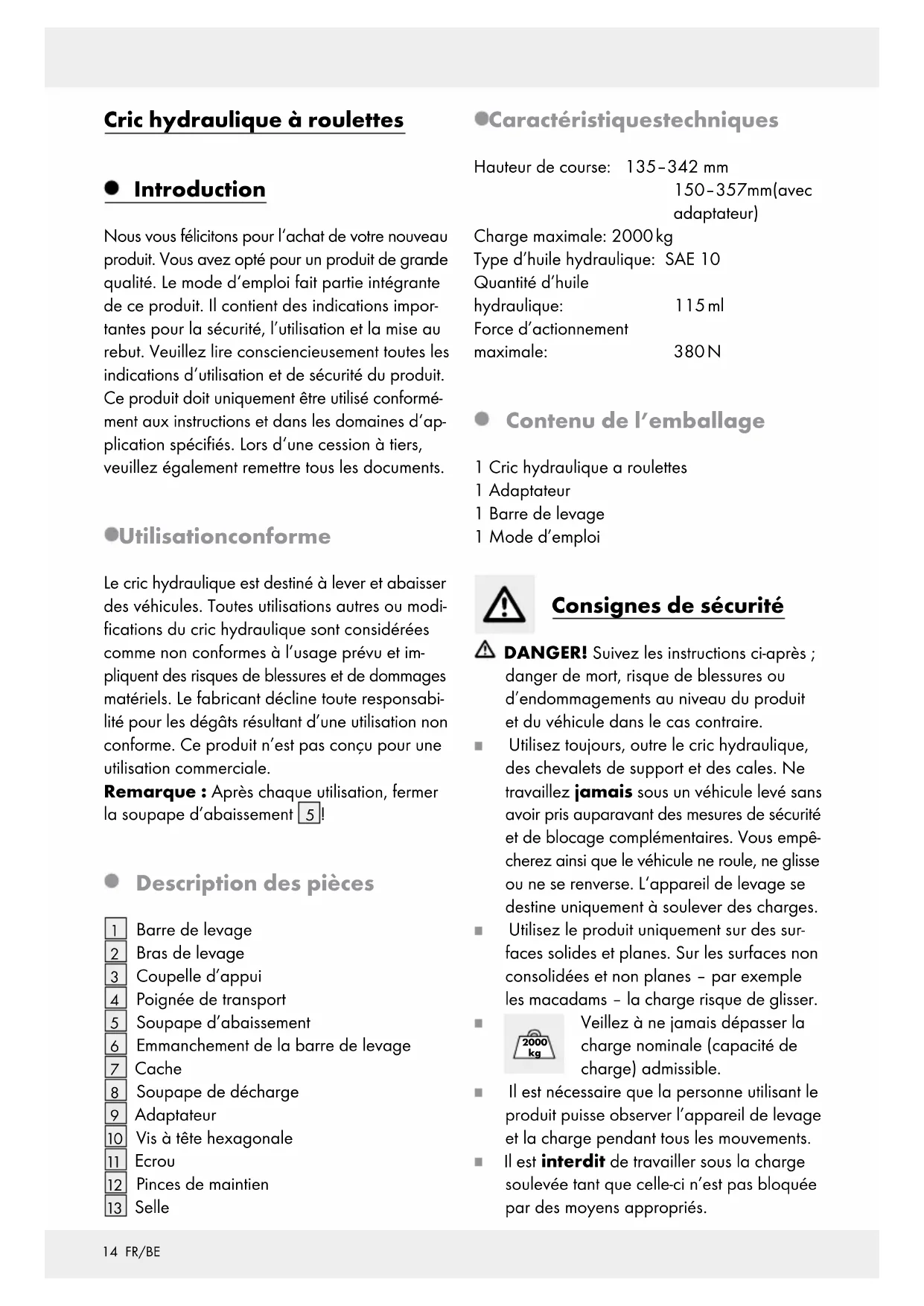 Selle Caractéristiques techniques Hauteur de course: 135–342 mm 150–357 mm (avec adaptateur) Charge maximale: 2000 kg Type d’huile hydraulique: SAE 10 Quantité d’huile hydraulique: 115 ml Force d’actionnement maximale: 380 N Contenu de l’emballage 1 Cric hydraulique a roulettes 1 Adaptateur 1 Barre de levage 1 Mode d’emploi Consignes de sécurité DANGER! Suivez les instructions ci-après; danger de mort, risque de blessures ou d’endommagements au niveau du produit et du véhicule dans le cas contraire. Utilisez toujours, outre le cric hydraulique, des chevalets de support et des cales. Ne travaillez jamais sous un véhicule levé sans avoir pris auparavant des mesures de sécurité et de blocage complémentaires. Vous empê- cherez ainsi que le véhicule ne roule, ne glisse ou ne se renverse. L‘appareil de levage se destine uniquement à soulever des charges. Utilisez le produit uniquement sur des sur- faces solides et planes. Sur les surfaces non consolidées et non planes – par exemple les macadams – la charge risque de glisser.