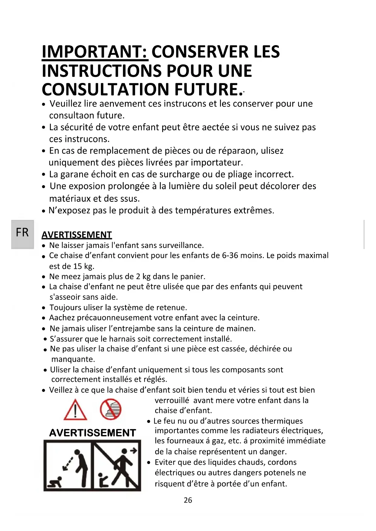Le feu nu ou d’autres sources thermiques importantes comme les radiateurs électriques, les fourneaux á gaz, etc. á proximité immédiate de la chaise représentent un danger. Eviter que des liquides chauds, cordons électriques ou autres dangers potentiels ne risquent d’être à portée d’un enfant. AVERTISSEMENT27