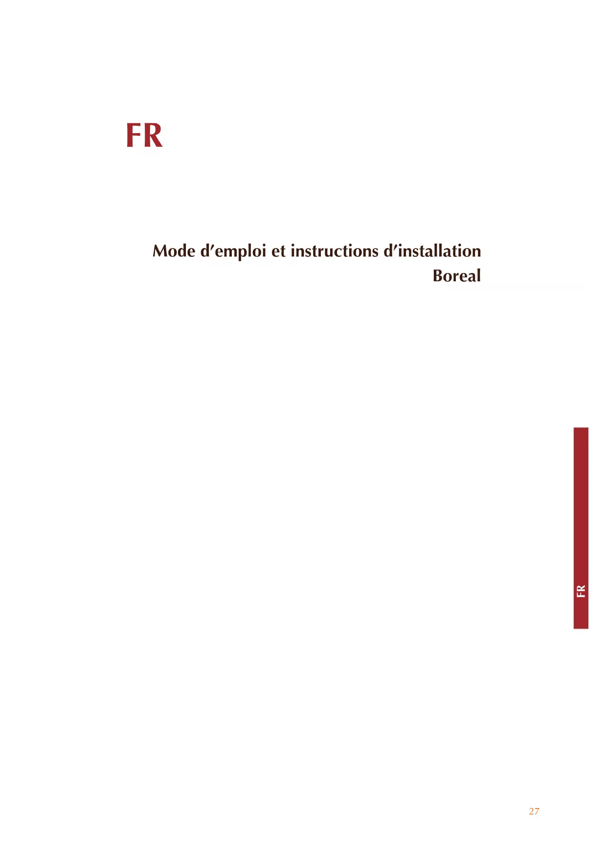Mode d’emploi et instructions d’installation Boreal FR28 Cher client, Nous vous félicitons pour l’acquisition de votre nouveau poêle à bois de WANDERS. C’est une source de chaleur confortable qui vous donnera beaucoup de plaisir pendant de longues années. C e poêle à bois splendide a tout pour séduire les clients les plus exigeants en ce qui concerne la facilité d’emploi, la sécurité et le design. D’une conception bien pensée pour satisfaire les demandes avancées de nos clients, le Boreal est proposé en plusieurs options. La première partie de ce mode d’emploi est consacrée aux conseils pour une utilisation correcte de votre poêle à bois en toute sécurité. La deuxième partie comporte les instructions d’installation et les caractéristiques techniques destinées notamment à l’installateur. Nous vous recommandons de lire ce manuel attentivement avant la mise en service de votre poêle à bois et de bien le conserver. Votre installateur en aura besoin pour l’entretien annuel de votre poêle. Nous espérons que vous profiterez beaucoup de l’ambiance chaleureuse du Boreal. L’ Equip de WANDERS29