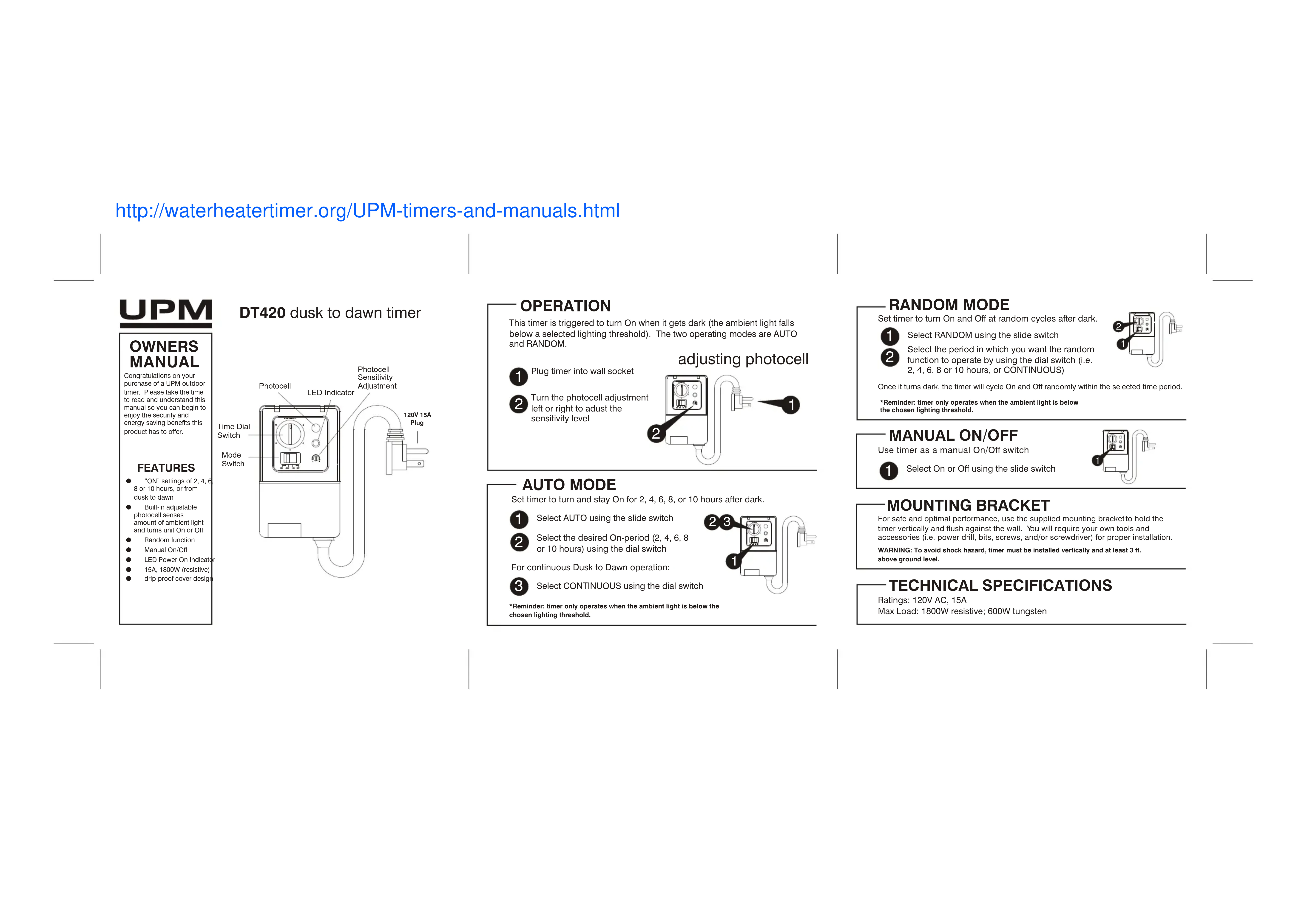Photocellule Indicateur de DEL Cadran de l'heure Commande de fonction Prise 120 V 15 A Réglage de sensibilité de la photocelluleette minuterie est conçue pour se mettre en marche lorsqu'il fait noir (la première du jour tombe sous un seuil de luminosité sélectionné). Les deux modes de fonctionnement sont AUTO et ALÉATOIRE.
