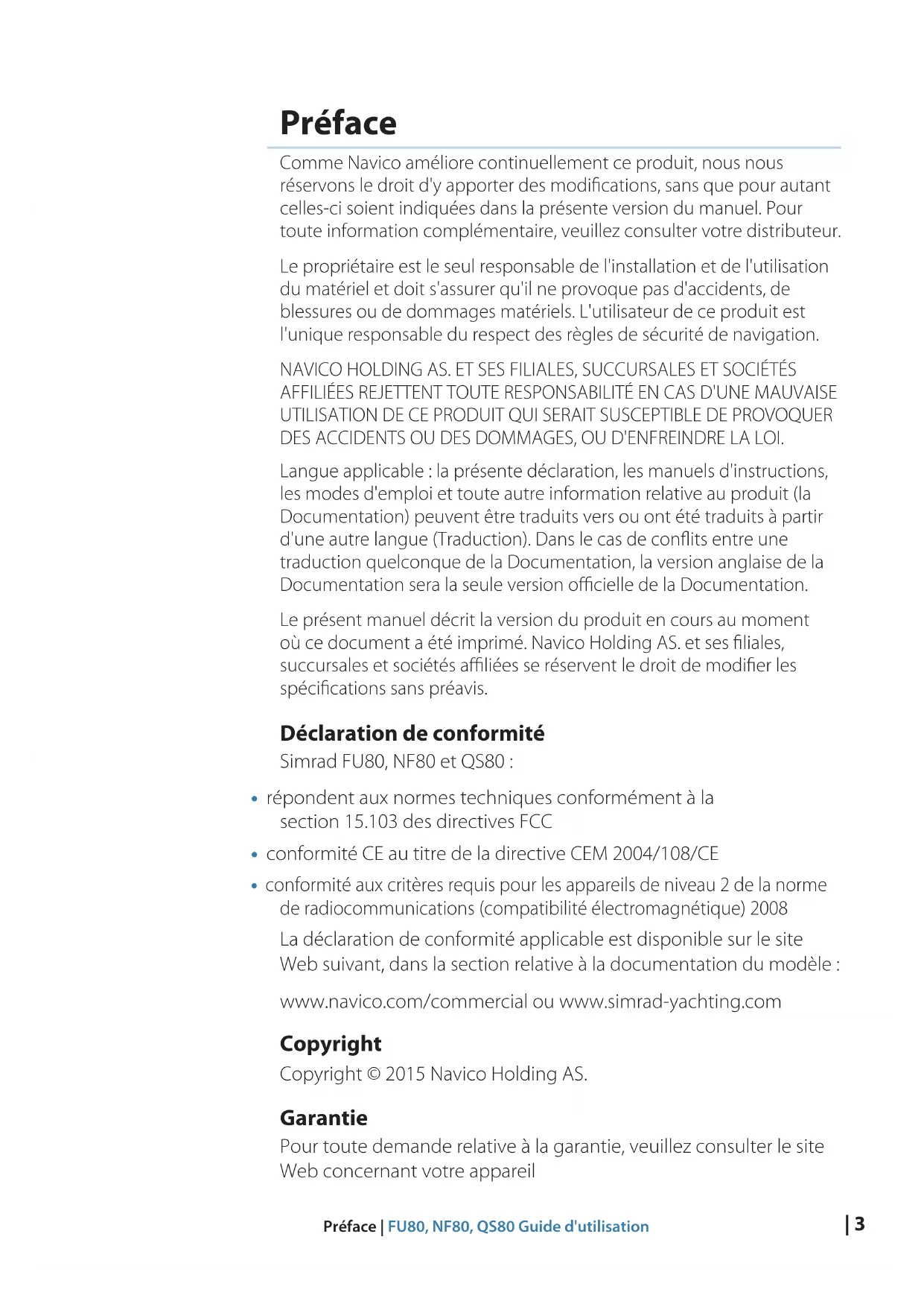 Comme Navico améliore continuellement ce produit, nous nous réservons le droit d'y apporter des modifications, sans que pour autant celles-ci soient indiquées dans la présente version du manuel. Pour toute information complémentaire, veuillez consulter votre distributeur.
