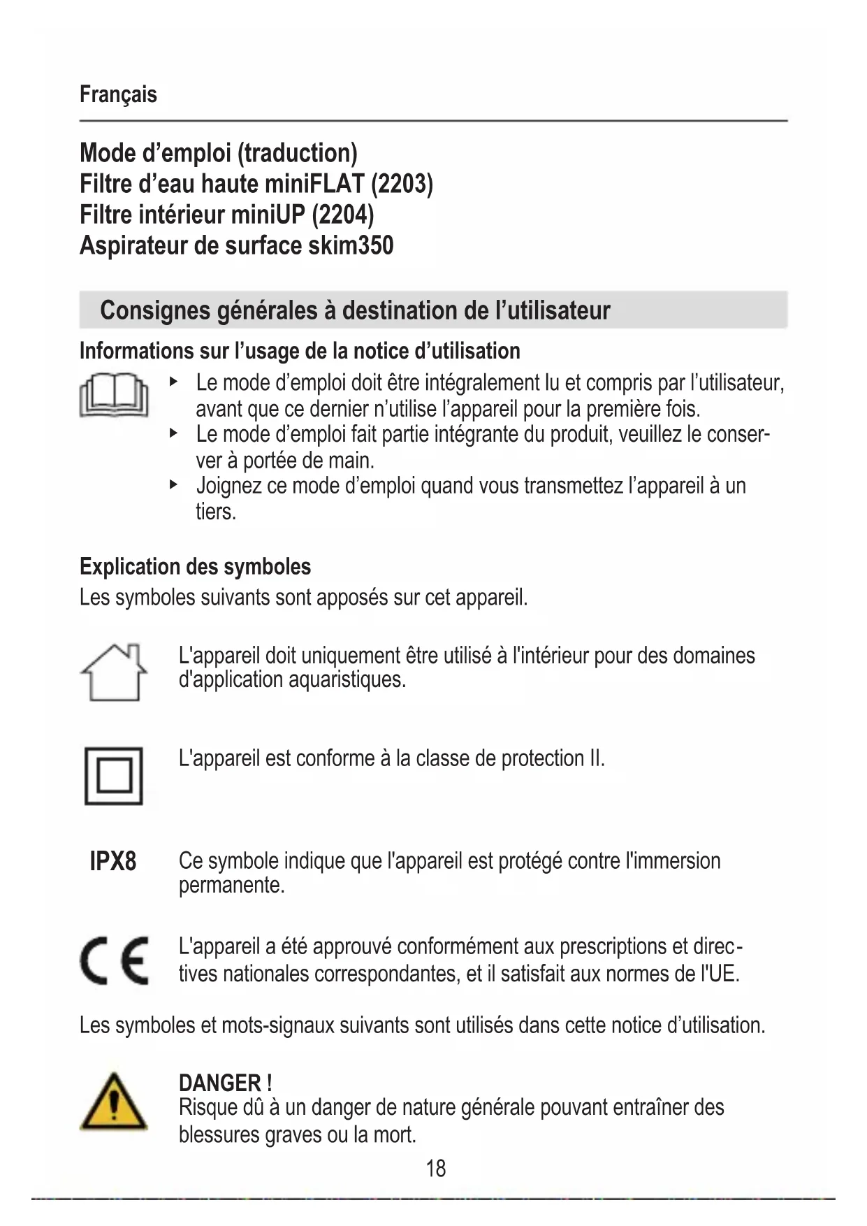 Mode d’emploi (traduction) Filtre d’eau haute miniFLAT (2203) Filtre intérieur miniUP (2204) Aspirateur de surface skim350 Consignes générales à destination de l’utilisateur Informations sur l’usage de la notice d’utilisation ▶ Le mode d’emploi doit être intégralement lu et compris par l’utilisateur, avant que ce dernier n’utilise l’appareil pour la première fois. ▶ Le mode d’emploi fait partie intégrante du produit, veuillez le conser