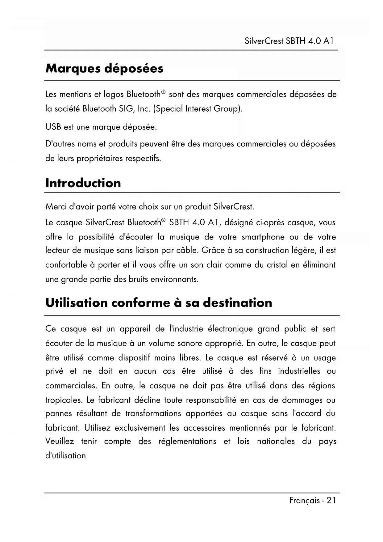 - Marquages de conformité Remarques sur la garantie et en cas d'intervention technique 36 SilverCrest SBTH 4.0 A1 Français - 21 Marques déposées Les mentions et logos Bluetooth p. 35