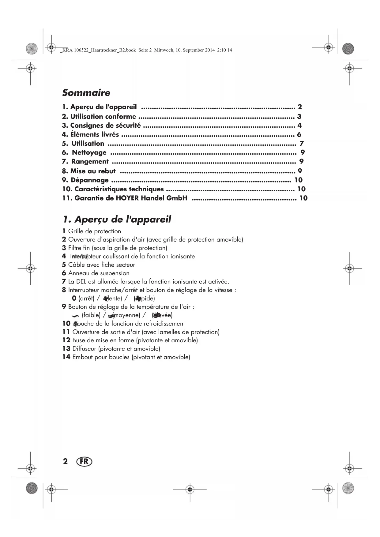 1 Grille de protection 2 Ouverture d'aspiration d'air (avec grille de protection amovible) 3 Filtre fin (sous la grille de protection) 4 Interrupteur coulissant de la fonction ionisante 5 Câble avec fiche secteur 6 Anneau de suspension 7 La DEL est allumée lorsque la fonction ionisante est activée. 8 Interrupteur marche/arrêt et bouton de réglage de la vitesse : 0 (arrêt) / (lente) / (rapide) 9 Bouton de réglage de la température de l'air : (faible) / (moyenne) / (élevée) 10 Touche de la fonction de refroidissement 11 Ouverture de sortie d'air (avec lamelles de protection) 12 Buse de mise en forme (pivotante et amovible) 13 Diffuseur (pivotante et amovible) 14 Embout pour boucles (pivotant et amovible) _KRA 106522_Haartrockner_B2.book Seite 2 Mittwoch, 10. September 2014 2:10 143
