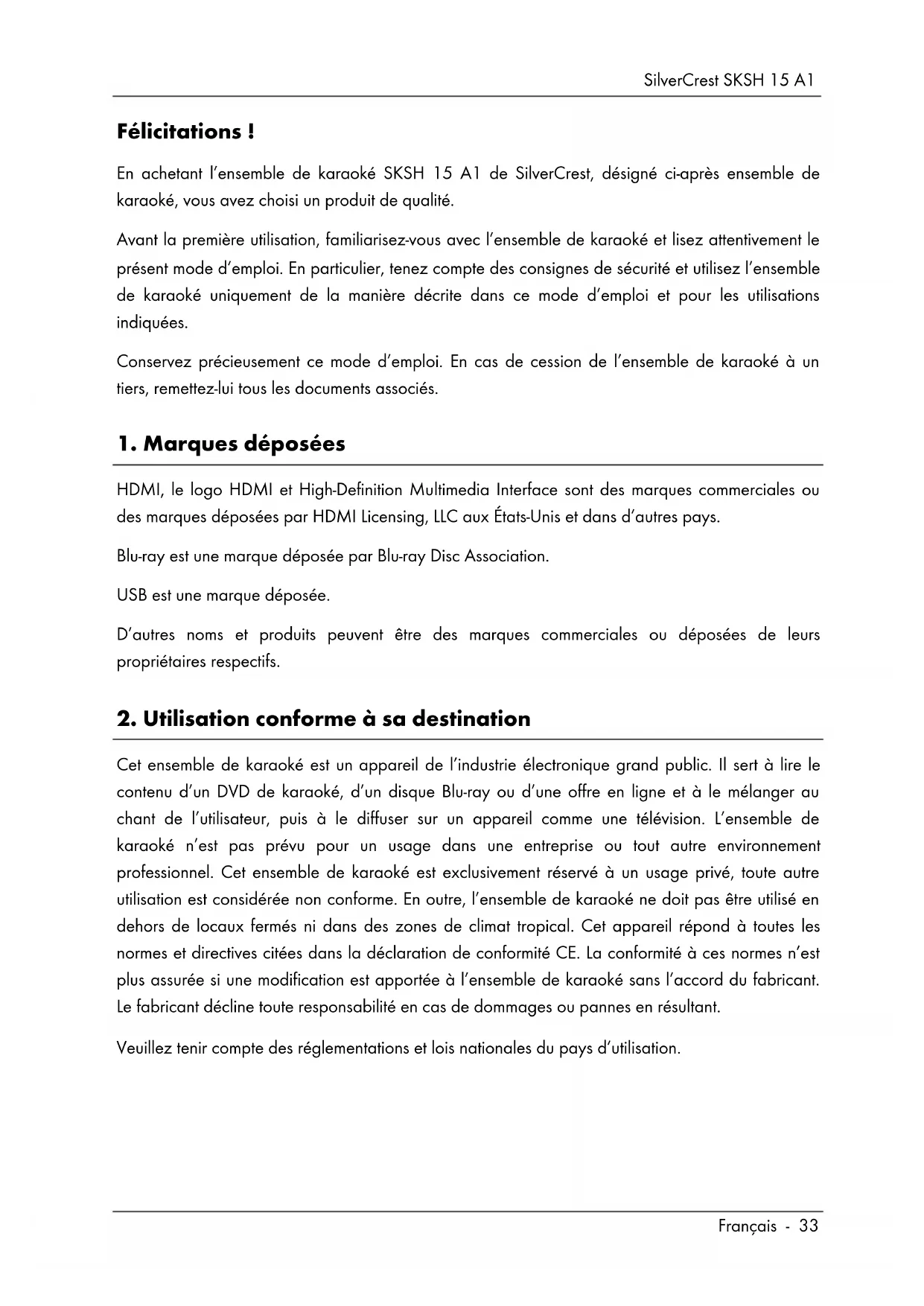 Cet ensemble de karaoké est un appareil de l’industrie électronique grand public. Il sert à lire le contenu d’un DVD de karaoké, d’un disque Blu-ray ou d’une offre en ligne et à le mélanger au chant de l’utilisateur, puis à le diffuser sur un appareil comme une télévision. L’ensemble de karaoké n’est pas prévu pour un usage dans une entreprise ou tout autre environnement professionnel. Cet ensemble de karaoké est exclusivement réservé à un usage privé, toute autre utilisation est considérée non conforme. En outre, l’ensemble de karaoké ne doit pas être utilisé en dehors de locaux fermés ni dans des zones de climat tropical. Cet appareil répond à toutes les normes et directives citées dans la déclaration de conformité CE. La conformité à ces normes n’est plus assurée si une modification est apportée à l’ensemble de karaoké sans l’accord du fabricant. Le fabricant décline toute responsabilité en cas de dommages ou pannes en résultant. Veuillez tenir compte des réglementations et lois nationales du pays d’utilisation.SilverCrest SKSH 15 A1