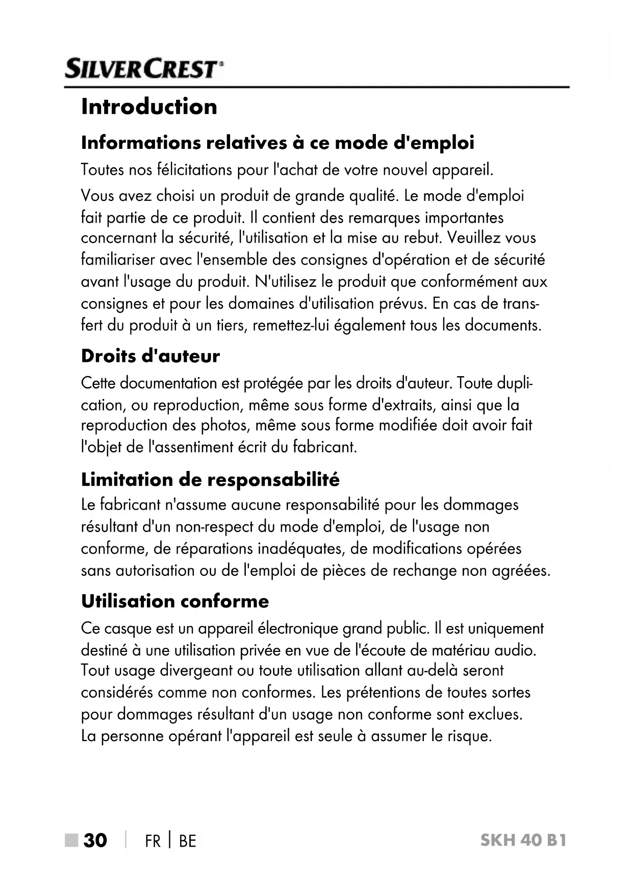 Introduction Informations relatives à ce mode d'emploi Toutes nos félicitations pour l'achat de votre nouvel appareil. Vous avez choisi un produit de grande qualité. Le mode d'emploi fait partie de ce produit. Il contient des remarques importantes concernant la sécurité, l'utilisation et la mise au rebut. Veuillez vous familiariser avec l'ensemble des consignes d'opération et de sécurité avant l'usage du produit. N'utilisez le produit que conformément aux consignes et pour les domaines d'utilisation prévus. En cas de trans- fert du produit à un tiers, remettez-lui également tous les documents. Droits d'auteur Cette documentation est protégée par les droits d'auteur. Toute dupli- cation, ou reproduction, même sous forme d'extraits, ainsi que la reproduction des photos, même sous forme modifiée doit avoir fait l'objet de l'assentiment écrit du fabricant. Limitation de responsabilité Le fabricant n'assume aucune responsabilité pour les dommages résultant d'un non-respect du mode d'emploi, de l'usage non conforme, de réparations inadéquates, de modifications opérées sans autorisation ou de l'emploi de pièces de rechange non agréées. Utilisation conforme Ce casque est un appareil électronique grand public. Il est uniquement destiné à une utilisation privée en vue de l'écoute de matériau audio. Tout usage divergeant ou toute utilisation allant au-delà seront considérés comme non conformes. Les prétentions de toutes sortes pour dommages résultant d'un usage non conforme sont exclues. La personne opérant l'appareil est seule à assumer le risque.SKH 40 B1