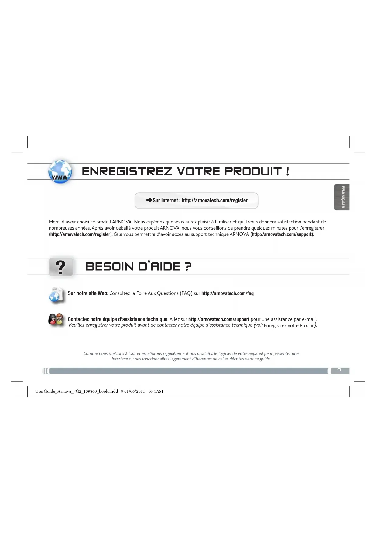 FRANÇAIS ENREGISTREZ VOTRE PRODUIT ! ÄSur Internet : http://arnovatech.com/register Merci d’avoir choisi ce produit ARNOVA. Nous espérons que vous aurez plaisir à l’utiliser et qu’il vous donnera satisfaction pendant de nombreuses années. Après avoir déballé votre produit ARNOVA, nous vous conseillons de prendre quelques minutes pour l’enregistrer (http://arnovatech.com/register). Cela vous permettra d’avoir accès au support technique ARNOVA (http://arnovatech.com/support). BESOIN D’AIDE ? Comme nous mettons à jour et améliorons régulièrement nos produits, le logiciel de votre appareil peut présenter une interface ou des fonctionnalités légèrement différentes de celles décrites dans ce guide. Sur notre site Web: Consultez la Foire Aux Questions (FAQ) sur http://arnovatech.com/faq Contactez notre équipe d’assistance technique: Allez sur http://arnovatech.com/support pour une assistance par e-mail. Veuillez enregistrer votre produit avant de contacter notre équipe d’assistance technique (voir Enregistrez votre Produit UserGuide_Arnova_7G2_109860_book.indd 9 01/06/2011 16:47:5110