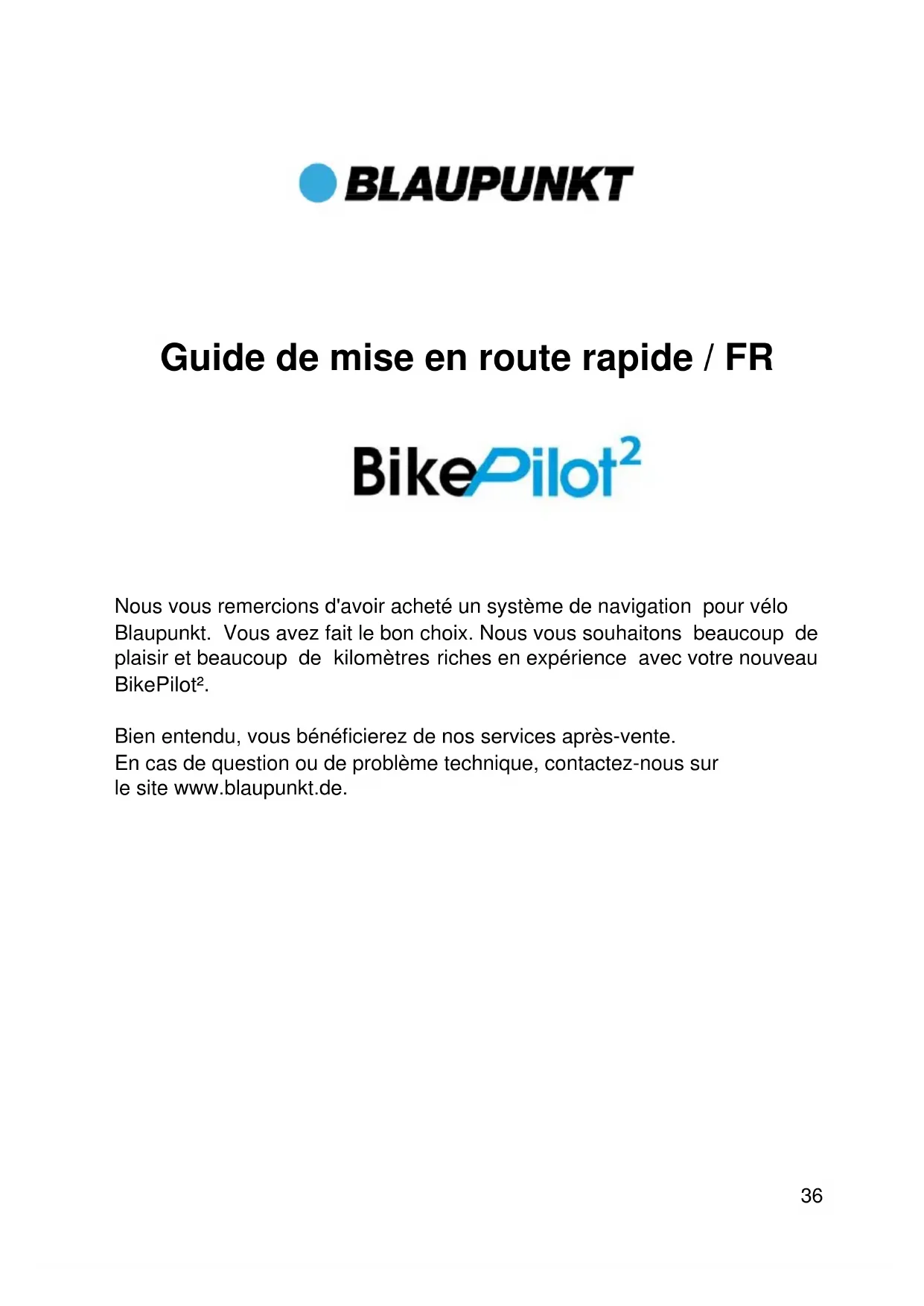 Nous vous remercions d'avoir acheté un système de navigation pour vélo Blaupunkt. Vous avez fait le bon choix. Nous vous souhaitons beaucoup de plaisir et beaucoup de kilomètres riches en expérience avec votre nouveau BikePilot². Bien entendu, vous bénéficierez de nos services après-vente. En cas de question ou de problème technique, contactez-nous sur le site www.blaupunkt.de.37