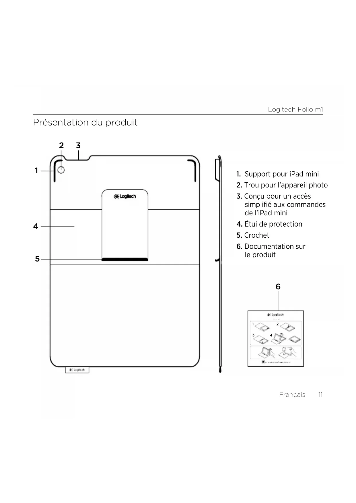 dans l'autre support: Pour utiliser votre iPad mini L'ouverture de l'étui allume votre iPad mini: La fermeture de l'étui remet votre iPad mini en mode veille.Logitech Folio m1 Français 13 Deux positions de visualisation L'étui ore deux positions de visualisation: une position de lecture et une position de navigation. Pour regarder du contenu multimédia, placez votre iPad mini à l'angle qui vous convient le mieux: Pour naviguer, repliez votre étui le long de sa colonne: Pour détacher votre iPad mini Pour détacher votre iPad mini de l'étui, inclinez l'un des coins du support vers l'arrière: Votre iPad mini est alors libre:Logitech Folio m1 14 Français Pages Produits Des informations et un support en ligne supplémentaires sont disponibles pour votre produit. Prenez le temps de visiter les pages Produits pour en savoir plus sur votre nouvel étui. www.logitech.com/support/folio-m1 Parcourez les articles en ligne pour obtenir de l'aide en matière de configuration, des conseils d'utilisation et des informations sur les fonctions supplémentaires. Connectez-vous avec d'autres utilisateurs sur nos forums communautaires pour demander des conseils, poser des questions et partager des solutions. Découvrez une large sélection de contenu: