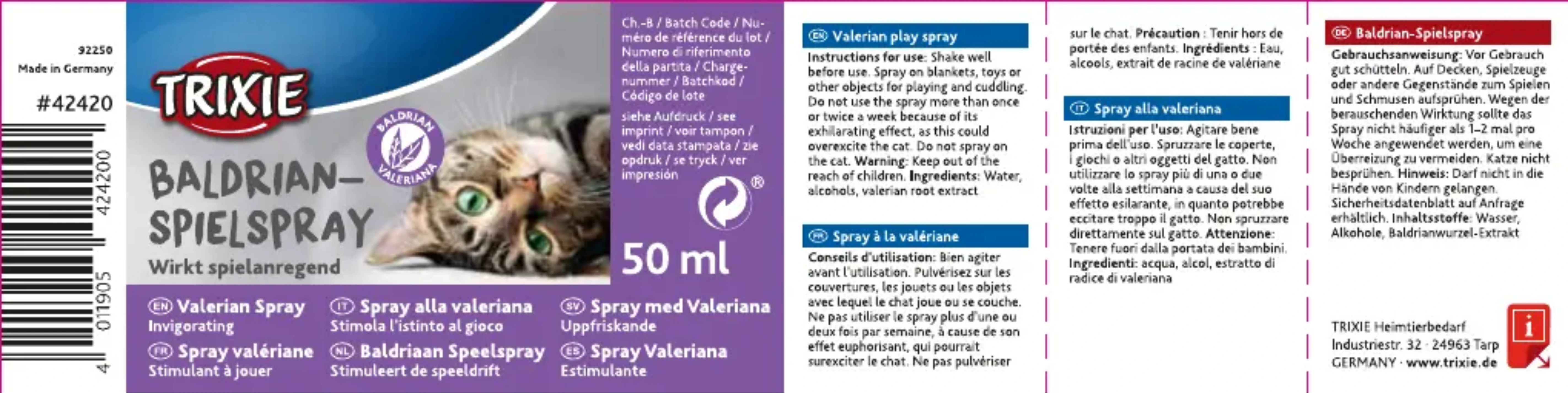 sur le chat. Précaution : Tenir hors de portée des enfants. Ingrédients : Eau, alcools, extrait de racine de valériane