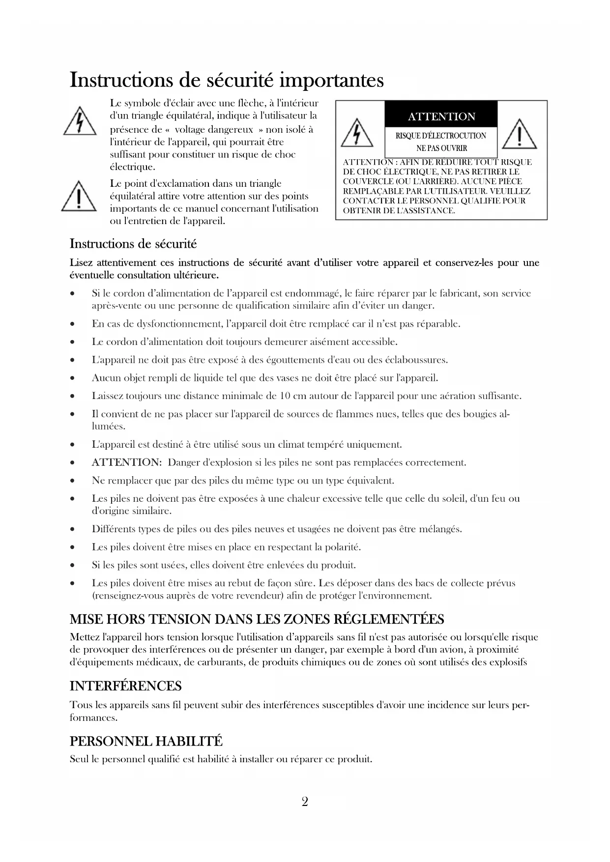 ACCESSOIRES STANDARDS .................................................................................. 13Instructions de sécurité importantes Le symbole d'éclair avec une flèche, à l'intérieur d'un triangle équilatéral, indique à l'utilisateur la présence de « voltage dangereux » non isolé à l'intérieur de l'appareil, qui pourrait être suffisant pour constituer un risque de choc électrique. Le point d'exclamation dans un triangle équilatéral attire votre attention sur des points importants de ce manuel concernant l'utilisation ou l'entretien de l'appareil. Instructions de sécurité Lisez attentivement ces instructions de sécurité avant d’utiliser votre appareil et conservez-les pour une éventuelle consultation ultérieure. Si le cordon d’alimentation de l’appareil est endommagé, le faire réparer par le fabricant, son service après-vente ou une personne de qualification similaire afin d’éviter un danger. En cas de dysfonctionnement, l’appareil doit être remplacé car il n’est pas réparable. Le cordon d’alimentation doit toujours demeurer aisément accessible. L'appareil ne doit pas être exposé à des égouttements d'eau ou des éclaboussures. Aucun objet rempli de liquide tel que des vases ne doit être placé sur l'appareil. Laissez toujours une distance minimale de 10 cm autour de l'appareil pour une aération suffisante. Il convient de ne pas placer sur l'appareil de sources de flammes nues, telles que des bougies al- lumées. L'appareil est destiné à être utilisé sous un climat tempéré uniquement. ATTENTION: Danger d'explosion si les piles ne sont pas remplacées correctement. Ne remplacer que par des piles du même type ou un type équivalent. Les piles ne doivent pas être exposées à une chaleur excessive telle que celle du soleil, d'un feu ou d'origine similaire. Différents types de piles ou des piles neuves et usagées ne doivent pas être mélangés. Les piles doivent être mises en place en respectant la polarité. Si les piles sont usées, elles doivent être enlevées du produit. Les piles doivent être mises au rebut de façon sûre. Les déposer dans des bacs de collecte prévus (renseignez-vous auprès de votre revendeur) afin de protéger l'environnement. MISE HORS TENSION DANS LES ZONES RÉGLEMENTÉES Mettez l'appareil hors tension lorsque l'utilisation d’appareils sans fil n'est pas autorisée ou lorsqu'elle risque de provoquer des interférences ou de présenter un danger, par exemple à bord d'un avion, à proximité d'équipements médicaux, de carburants, de produits chimiques ou de zones où sont utilisés des explosifs INTERFÉRENCES Tous les appareils sans fil peuvent subir des interférences susceptibles d'avoir une incidence sur leurs per- formances. PERSONNEL HABILITÉ Seul le personnel qualifié est habilité à installer ou réparer ce produit.