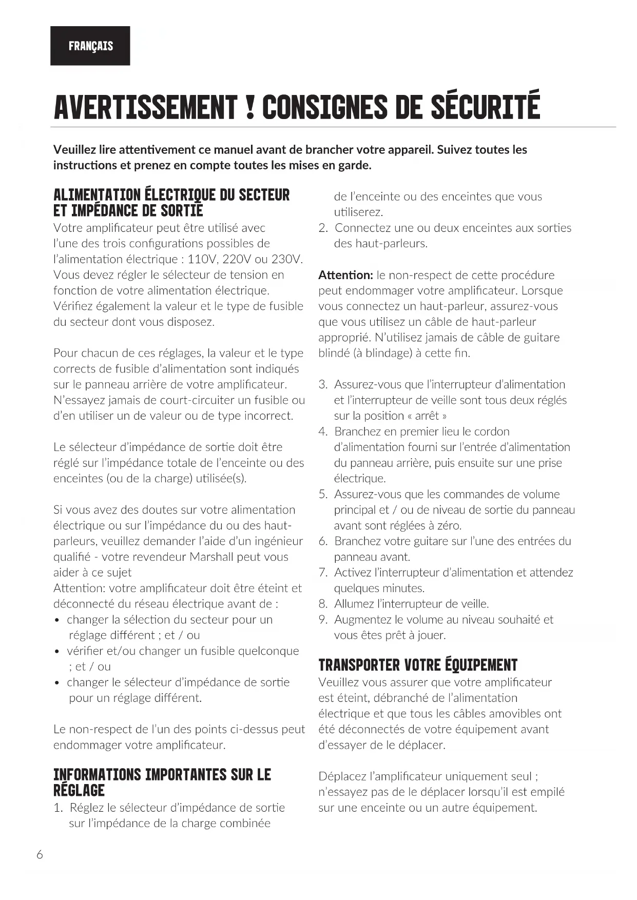 Votre amplicateur peut être ulisé avec l’une des trois conguraons possibles de l’alimentaon électrique : 110V, 220V ou 230V. Vous devez régler le sélecteur de tension en foncon de votre alimentaon électrique. Vériez également la valeur et le type de fusible du secteur dont vous disposez. Pour chacun de ces réglages, la valeur et le type corrects de fusible d’alimentaon sont indiqués sur le panneau arrière de votre amplicateur. N’essayez jamais de court-circuiter un fusible ou d’en uliser un de valeur ou de type incorrect. Le sélecteur d’impédance de sore doit être réglé sur l’impédance totale de l’enceinte ou des enceintes (ou de la charge) ulisée(s). Si vous avez des doutes sur votre alimentaon électrique ou sur l’impédance du ou des haut- parleurs, veuillez demander l’aide d’un ingénieur qualié - votre revendeur Marshall peut vous aider à ce sujet Aenon: votre amplicateur doit être éteint et déconnecté du réseau électrique avant de :