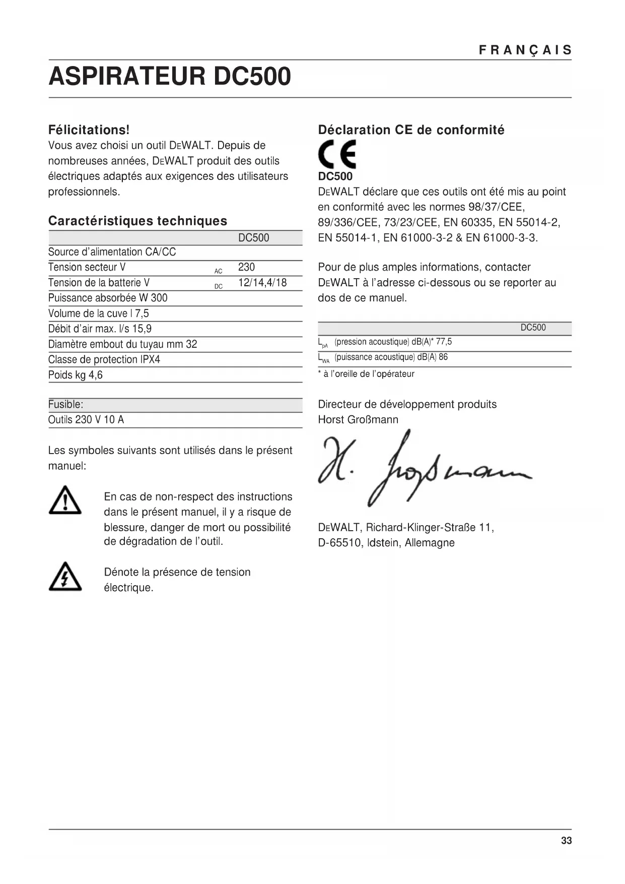 12/14,4/18 Puissance absorbée W 300 Volume de la cuve l 7,5 Débit d’air max. l/s 15,9 Diamètre embout du tuyau mm 32 Classe de protection IPX4 Poids kg 4,6 Fusible: Outils 230 V 10 A Les symboles suivants sont utilisés dans le présent manuel: En cas de non-respect des instructions dans le présent manuel, il y a risque de blessure, danger de mort ou possibilité de dégradation de l’outil. Dénote la présence de tension électrique. Déclaration CE de conformité DC500 DEWALT déclare que ces outils ont été mis au point en conformité avec les normes 98/37/CEE, 89/336/CEE, 73/23/CEE, EN 60335, EN 55014-2, EN 55014-1, EN 61000-3-2 & EN 61000-3-3. Pour de plus amples informations, contacter DEWALT à l’adresse ci-dessous ou se reporter au dos de ce manuel. DC500