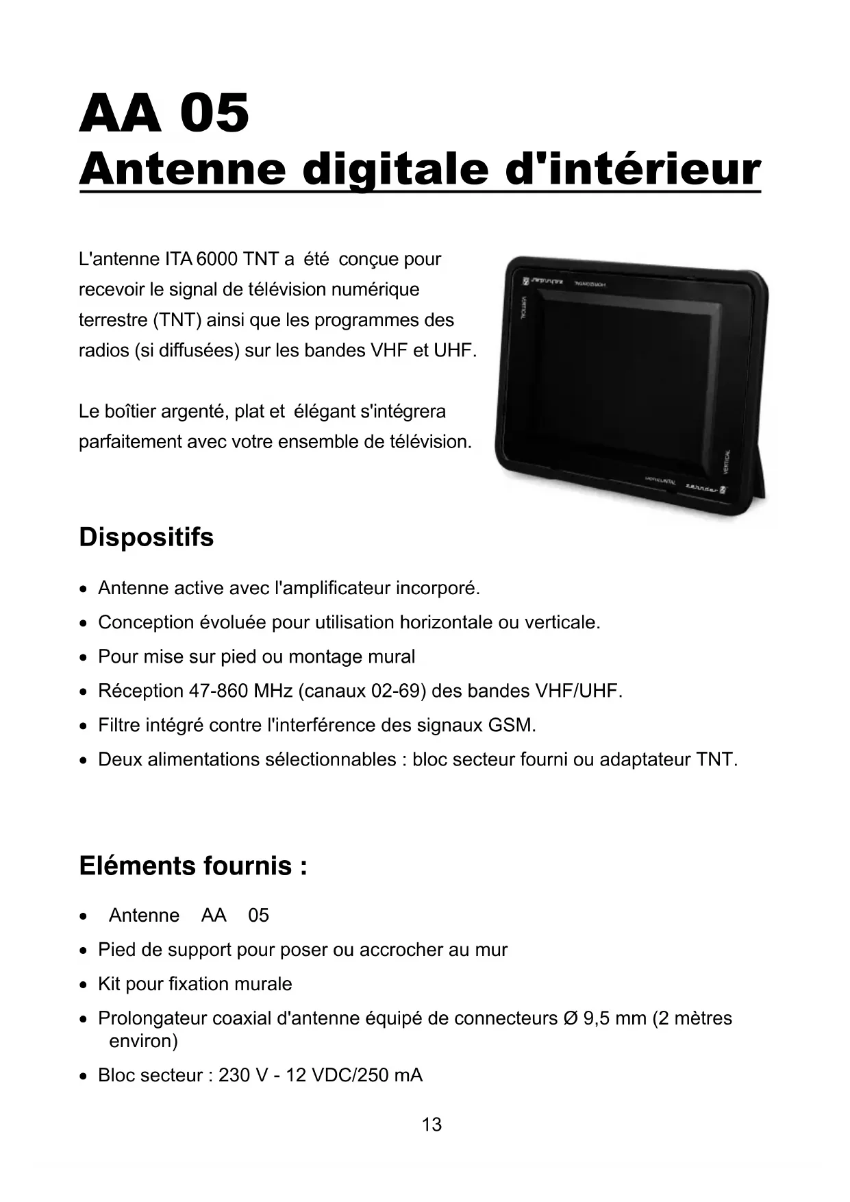 Eléments fournis : Antenne AA 05 Pied de support pour poser ou accrocher au mur Kit pour fixation murale Prolongateur coaxial d'antenne équipé de connecteurs Ø 9,5 mm (2 mètres environ) Bloc secteur : 230 V - 12 VDC/250 mA14