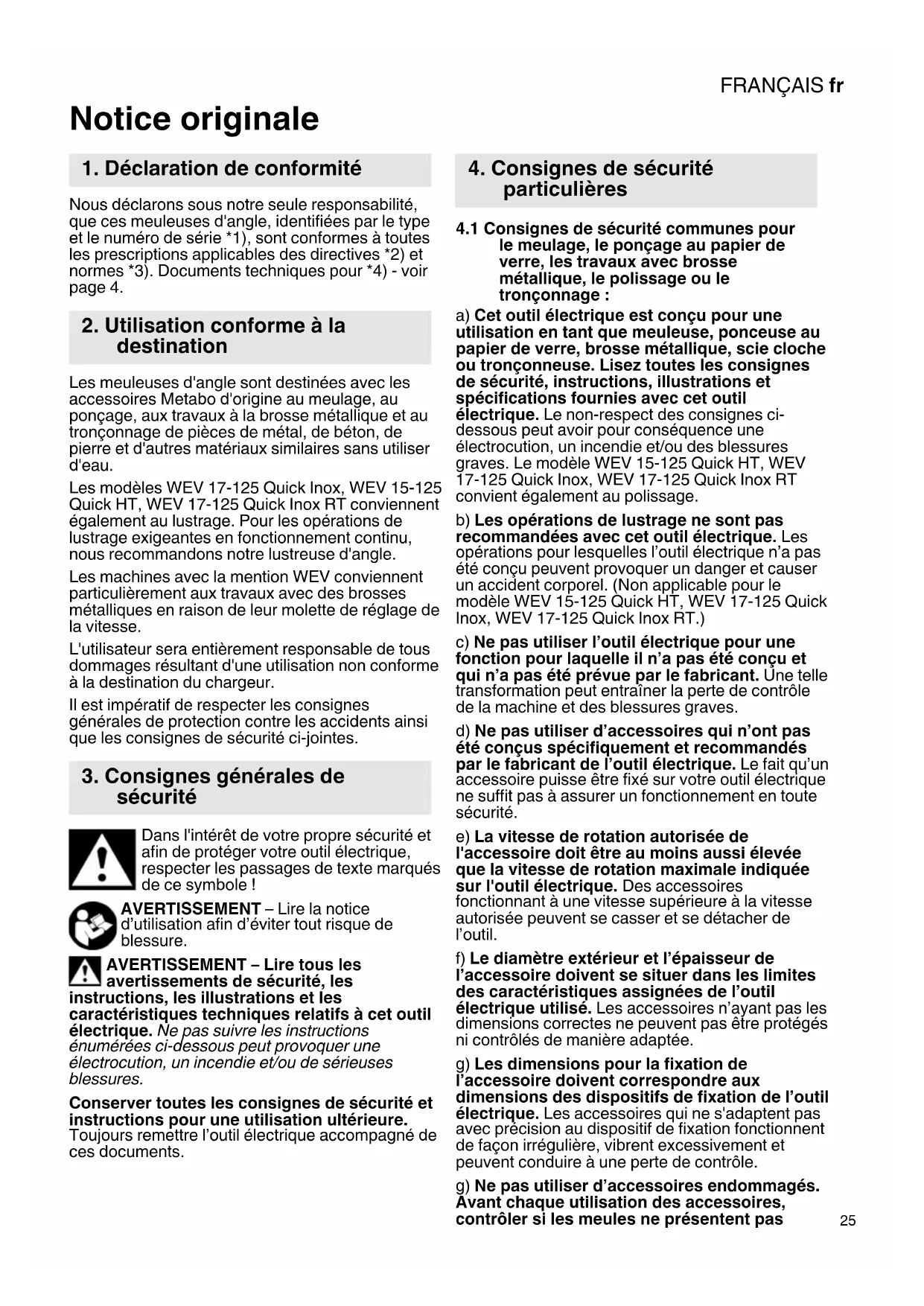 Notice originale Nous déclarons sous notre seule responsabilité, que ces meuleuses d'angle, identifiées par le type et le numéro de série *1), sont conformes à toutes les prescriptions applicables des directives *2) et normes *3). Documents techniques pour *4) - voir page 4. Les meuleuses d'angle sont destinées avec les accessoires Metabo d'origine au meulage, au ponçage, aux travaux à la brosse métallique et au tronçonnage de pièces de métal, de béton, de pierre et d'autres matériaux similaires sans utiliser d'eau. Les modèles WEV 17-125 Quick Inox, WEV 15-125 Quick HT, WEV 17-125 Quick Inox RT conviennent également au lustrage. Pour les opérations de lustrage exigeantes en fonctionnement continu, nous recommandons notre lustreuse d'angle. Les machines avec la mention WEV conviennent particulièrement aux travaux avec des brosses métalliques en raison de leur molette de réglage de la vitesse. L'utilisateur sera entièrement responsable de tous dommages résultant d'une utilisation non conforme à la destination du chargeur. Il est impératif de respecter les consignes générales de protection contre les accidents ainsi que les consignes de sécurité ci-jointes. Dans l'intérêt de votre propre sécurité et afin de protéger votre outil électrique, respecter les passages de texte marqués de ce symbole ! AVERTISSEMENT – Lire la notice d’utilisation afin d’éviter tout risque de blessure. AVERTISSEMENT – Lire tous les avertissements de sécurité, les instructions, les illustrations et les caractéristiques techniques relatifs à cet outil électrique. Ne pas suivre les instructions énumérées ci-dessous peut provoquer une électrocution, un incendie et/ou de sérieuses blessures. Conserver toutes les consignes de sécurité et instructions pour une utilisation ultérieure. Toujours remettre l’outil électrique accompagné de ces documents.