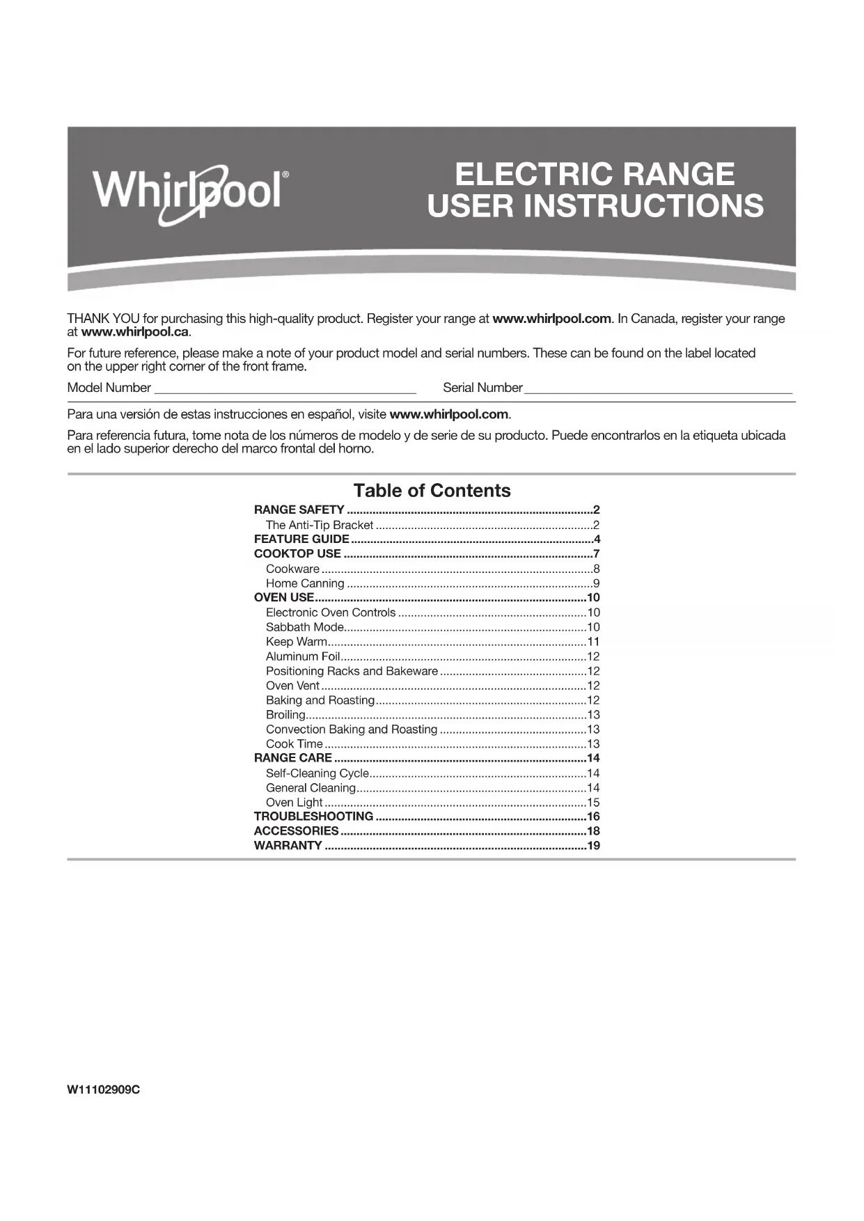 enlevés, modiés ou ne peuvent pas être facilement identiés.Le coût d’une réparation ou d’un remplacement dans le cadre de ces circonstances exclues est à la charge du client.43 11/14 CLAUSE D’EXONÉRATION DE RESPONSABILITÉ AU TITRE DES GARANTIES IMPLICITES LES GARANTIES IMPLICITES, Y COMPRIS LES GARANTIES APPLICABLES DE QUALITÉ MARCHANDE OU D’APTITUDE À UN USAGE PARTICULIER, SONT LIMITÉES À UN AN OU À LA PLUS COURTE PÉRIODE AUTORISÉE PAR LA LOI. Certains États et provinces ne permettent pas de limitation sur la durée des garanties implicites de qualité marchande ou d’aptitude à un usage particulier, de sorte que la limitation ci- dessus peut ne pas être applicable dans votre cas. Cette garantie vous confère des droits juridiques spéciques et vous pouvez également jouir d’autres droits qui peuvent varier d’une juridiction à l’autre. EXONÉRATION DE RESPONSABILITÉ DANS LES DOMAINES NON COUVERTS PAR LA GARANTIE Whirlpool décline toute responsabilité au titre de la qualité, de la durabilité ou en cas de dépannage ou de réparation nécessaire sur ce gros appareil ménager autre que les responsabilités énoncées dans la présente garantie. Si vous souhaitez une garantie plus étendue ou plus complète que la garantie limitée fournie avec ce gros appareil ménager, adressez-vous à Whirlpool ou à votre détaillant pour obtenir les modalités d’achat d’une garantie étendue. LIMITATION DES RECOURS; EXCLUSION DES DOMMAGES FORTUITS OU INDIRECTS LE SEUL ET EXCLUSIF RECOURS DU CLIENT DANS LE CADRE DE LA PRÉSENTE GARANTIE LIMITÉE CONSISTE EN LA RÉPARATION PRÉVUE PAR LA PRÉSENTE. WHIRLPOOL N’ASSUME AUCUNE RESPONSABILITÉ POUR LES DOMMAGES FORTUITS OU INDIRECTS. Certains États et certaines provinces ne permettent pas l’exclusion ou la limitation des dommages fortuits ou indirects de sorte que ces limitations et exclusions peuvent ne pas être applicables dans votre cas. Cette garantie vous confère des droits juridiques spéciques et vous pouvez également jouir d’autres droits qui peuvent varier d’une juridiction à l’autre.W11102909C SP PN W11102913C