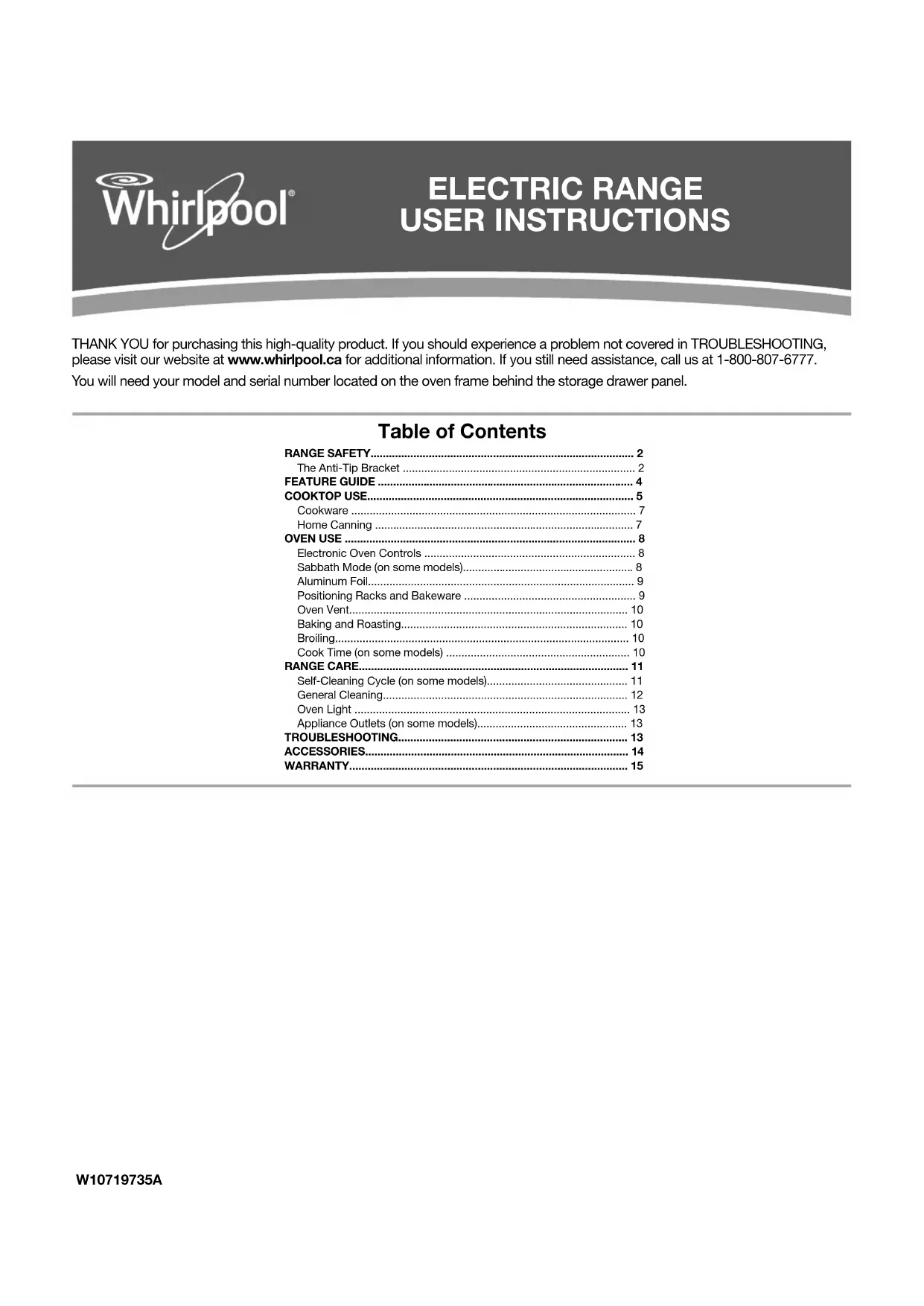Ce manuel couvre différents modèles. Le modèle que vous avez peut comporter toutes les caractéristiques énumérées ou seulement certaines d'entre elles. Se reporter à ce manuel ou à la section Foire Aux Questions (FAQ) de notre site Web à www.whirlpool.com pour des instructions plus détaillées. Au Canada, consulter la section de service à la clientèle sur www.whirlpool.ca. AVERTISSEMENT Risque d'empoisonnement alimentaire Ne pas laisser des aliments dans un four plus d'une heure avant ou après la cuisson. Le non-respect de cette instruction peut causer un empoisonnement alimentaire ou une maladie.