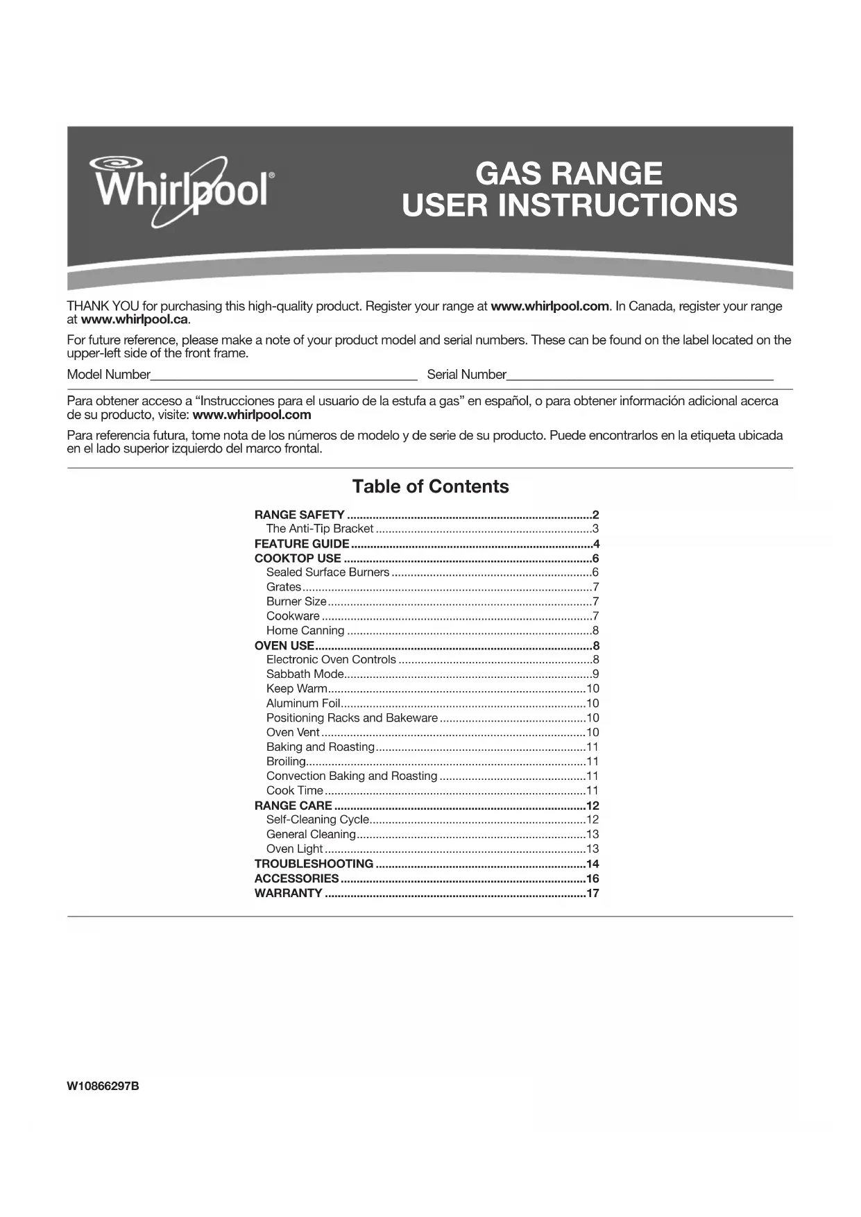 MERCI d’avoir acheté ce produit de grande qualité. Enregistrez la cuisinière sur www.whirlpool.com. Au Canada, enregistrer la cuisinière sur www.whirlpool.ca. Pour référence ultérieure, consignez par écrit les numéros de modèle et de série de votre produit. Ces numéros figurent sur l’étiquette située sur le côté supérieur gauche du cadre avant Numéro de modèle__________________________________________ Numéro de série du produit___________________________________ Table des matières