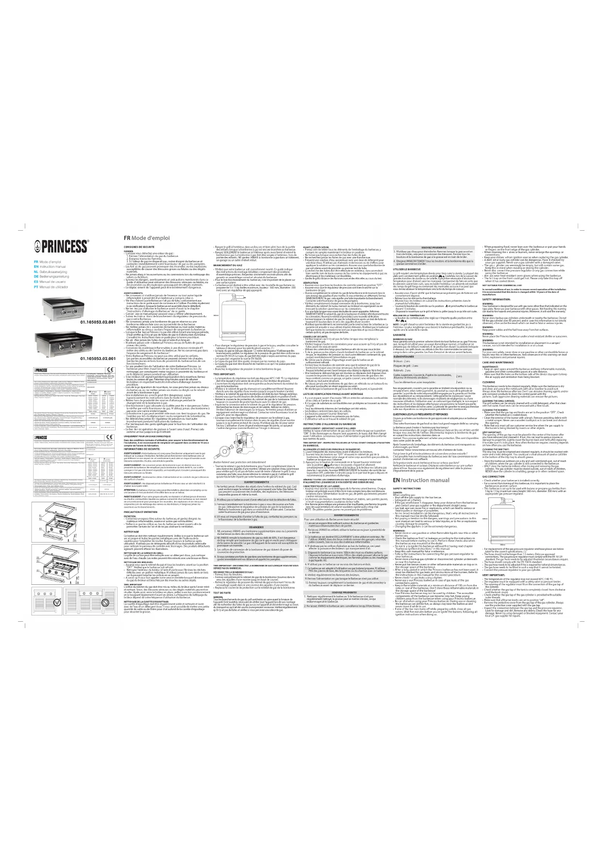 Brûleurs : 2 ans Plaques de grill : 2 ans Robinets : 2 ans Cadre, Logement, Couvercle, Pupitre de commandes, Allumeur et éléments similaires : 2 ans Tous les éléments en acier inoxydable : 2 ans Nos engagements couverts par la garantie se limitent à la réparation ou au remplacement, selon notre jugement, du produit au cours de la période de garantie. La portée de notre responsabilité engagée par la garantie est limitée aux réparations et au remplacement. Cette garantie ne couvre pas l'usure normale des éléments ni les dommages résultants de négligences ou d'une mauvaise utilisation, l'utilisation avec un carburant/gaz inadapté, le non-respect des instructions et les réglages eectué par une personne ne faisant pas partie du service d'entretien de notre usine. La période de garantie ne sera pas étendue suite aux réparations ou remplacements précédemment mentionnés. QUESTIONS LES PLUS FRÉQUENTES ET RÉPONSES Où puis-je acheter une bonbonne de gaz approuvée et adaptée pour ce barbecue Princess? Chez votre fournisseur de gaz local ou dans tout grand magasin dédié au camping. Le Barbecue peut-il rester à l'extérieur par tout temps? Nous recommandons de ranger votre Barbecue dans un lieu sec et bien ventilé lorsque vous avez ni de l'utiliser. Déconnectez toujours la bonbonne de gaz en suivant les instructions données dans ce manuel. Vous pouvez également acheter une protection. Elles sont disponibles dans votre point de vente. Après l'ouverture de l'emballage, des éléments du barbecue sont manquants ou endommagés, que faire? Contactez Tristar (www.tristar.service.eu) an d'obtenir de l'aide. Puis-je laver le grill et/ou les plateaux de cuisson dans un lave-vaisselle ? C'est possible mais le nettoyage du barbecue avec de l'eau savonneuse ou un produit d'entretien est susant. De la graisse coule sous le barbecue et/ou sur sa base, que faire? Nettoyez le barbecue et sa base. Déplacez votre barbecue sur une surface plane et lisse. Assurez-vous également de régulièrement vider le plateau d'égouttement de la graisse.
