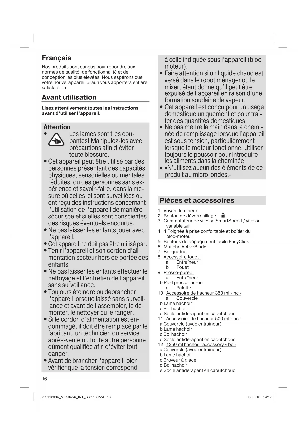 Register now at www.braunhousehold.co.uk By registering we may send you from time to time details on exclusive offers, promotions, recipes and inside tips. 5722112034_MQ9045X_INT_S6-116.indd 155722112034_MQ9045X_INT_S6-116.indd 15 06.06.16 14:1706.06.16 14:1716 Français Nos produits sont conçus pour répondre aux normes de qualité, de fonctionnalité et de conception les plus élevées. Nous espérons que votre nouvel appareil Braun vous apportera entière satisfaction. Avant utilisation Lisez attentivement toutes les instructions avant d’utiliser l’appareil. Attention